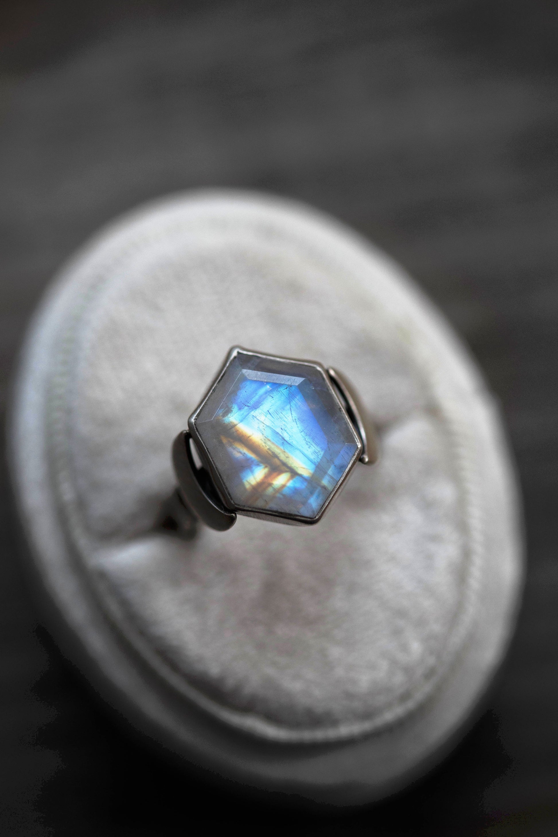 All set in sterling silver, with a brushed silver crescent moon balanced on either side of the stone.