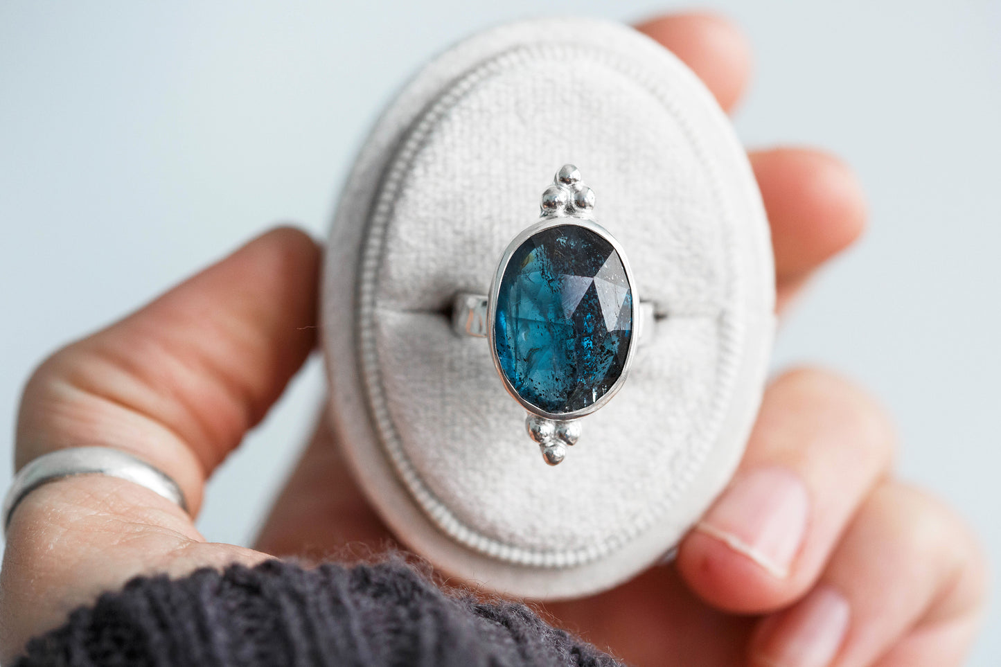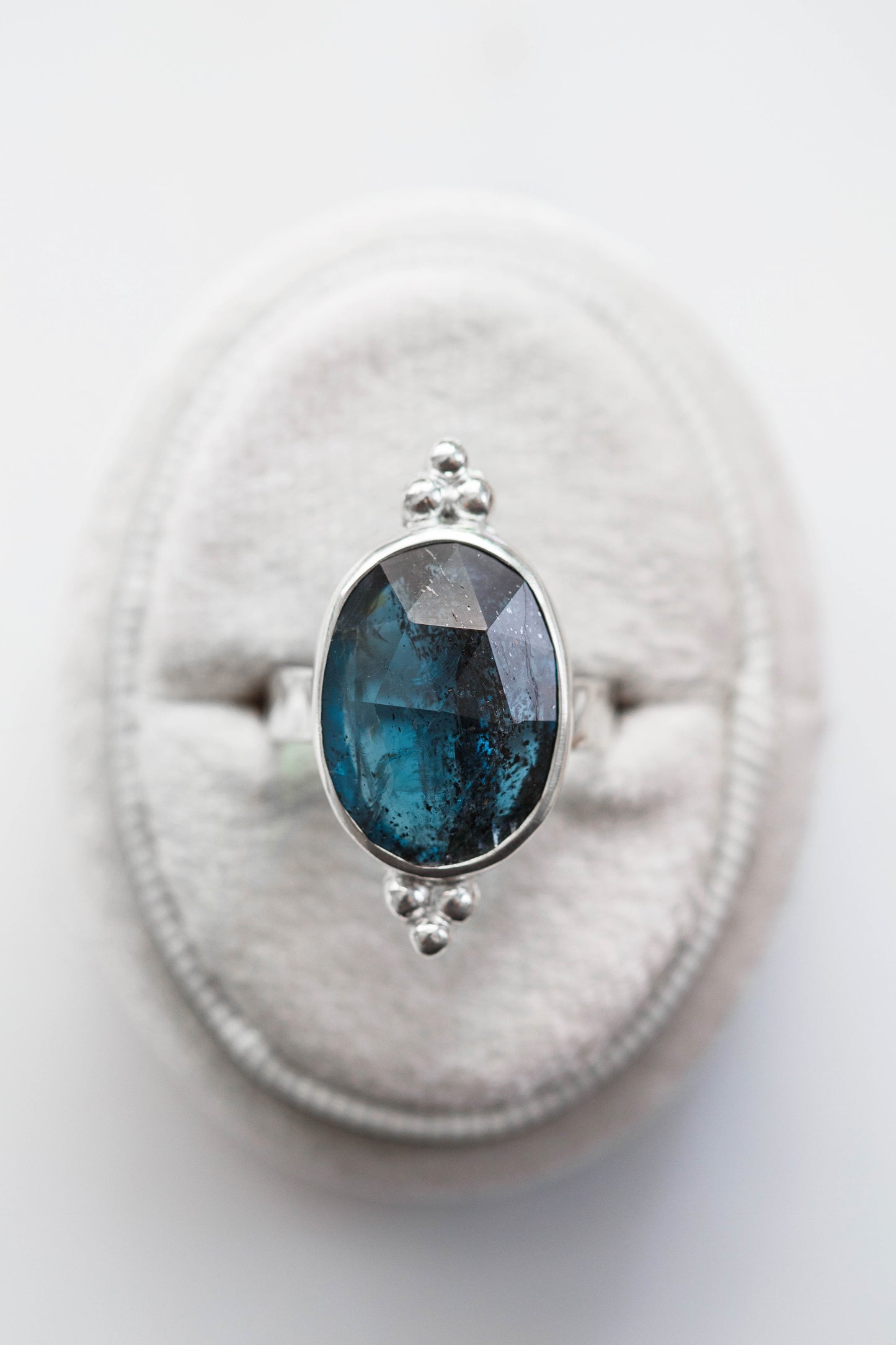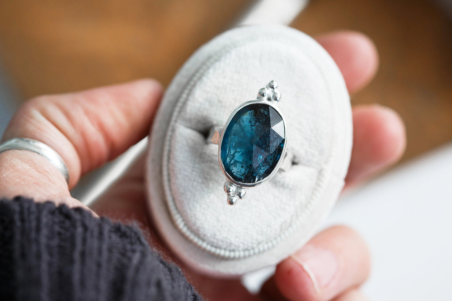 A ring for exploring ocean coves still sparkling with sea ice. A ring for the deep Atlantic, all saturated blues and shadows. A ring for mermaids and wave-walkers, ocean explorers with hearts made of sea salt. The teal blue kyanite gemstone drinks the light and holds it within.