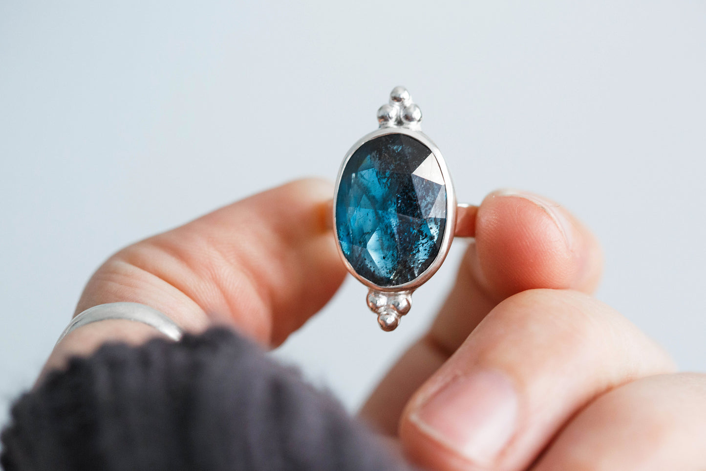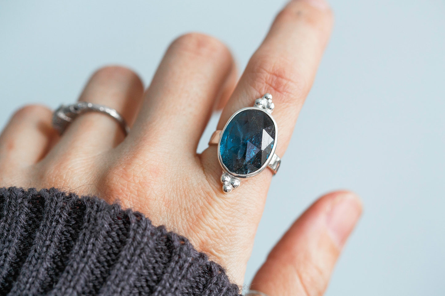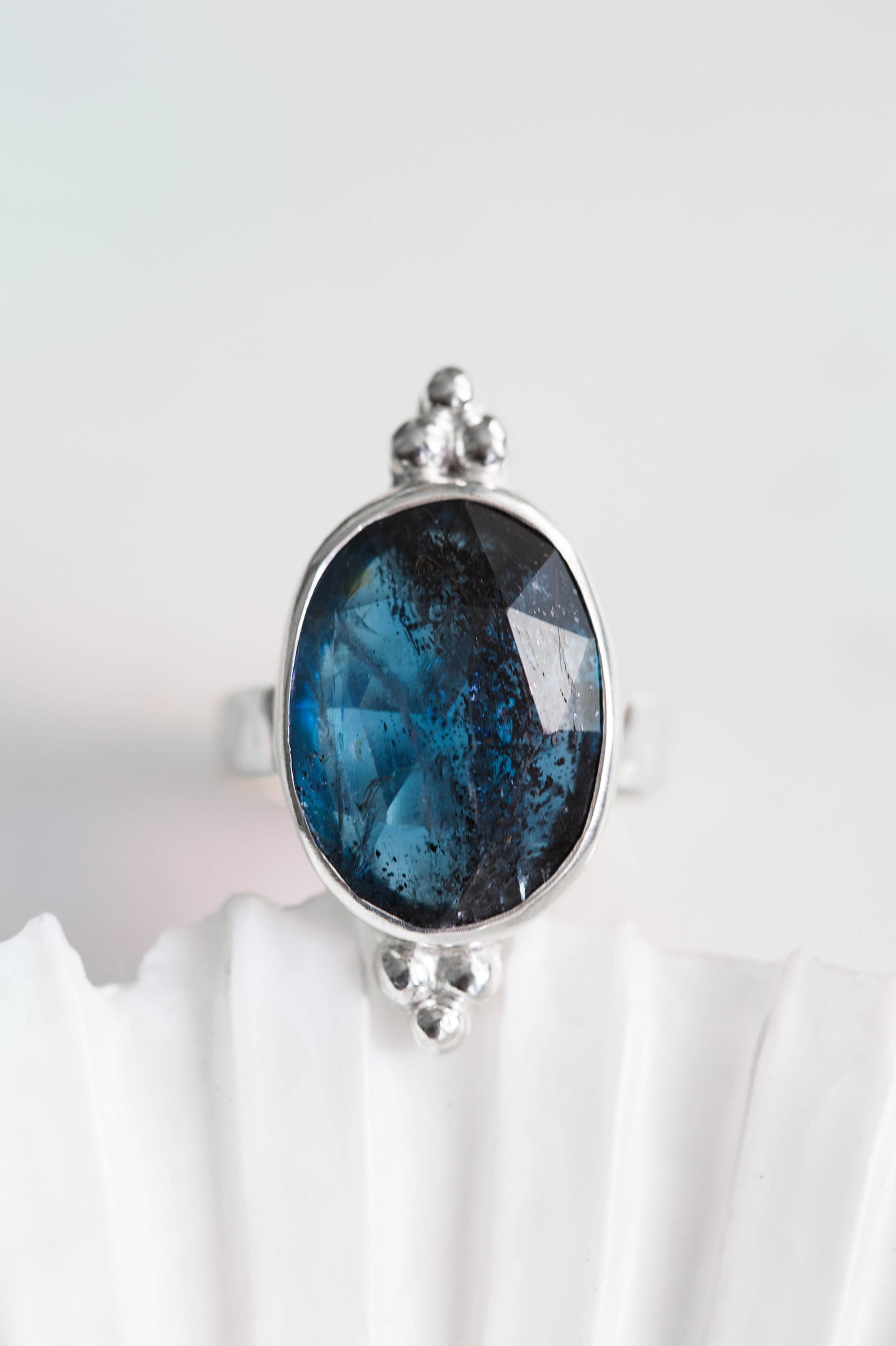 A ring for exploring ocean coves still sparkling with sea ice. A ring for the deep Atlantic, all saturated blues and shadows. A ring for mermaids and wave-walkers, ocean explorers with hearts made of sea salt. The teal blue kyanite gemstone drinks the light and holds it within.