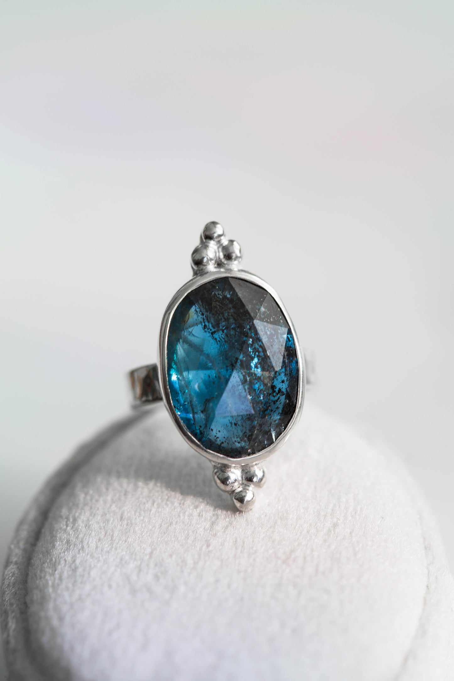 This ring is made from a natural, teal kyanite gemstone stone set in a straight bezel. Accenting the stone are two clusters of three silver pebbles, like beach stones smooth and shining from a recent wave.