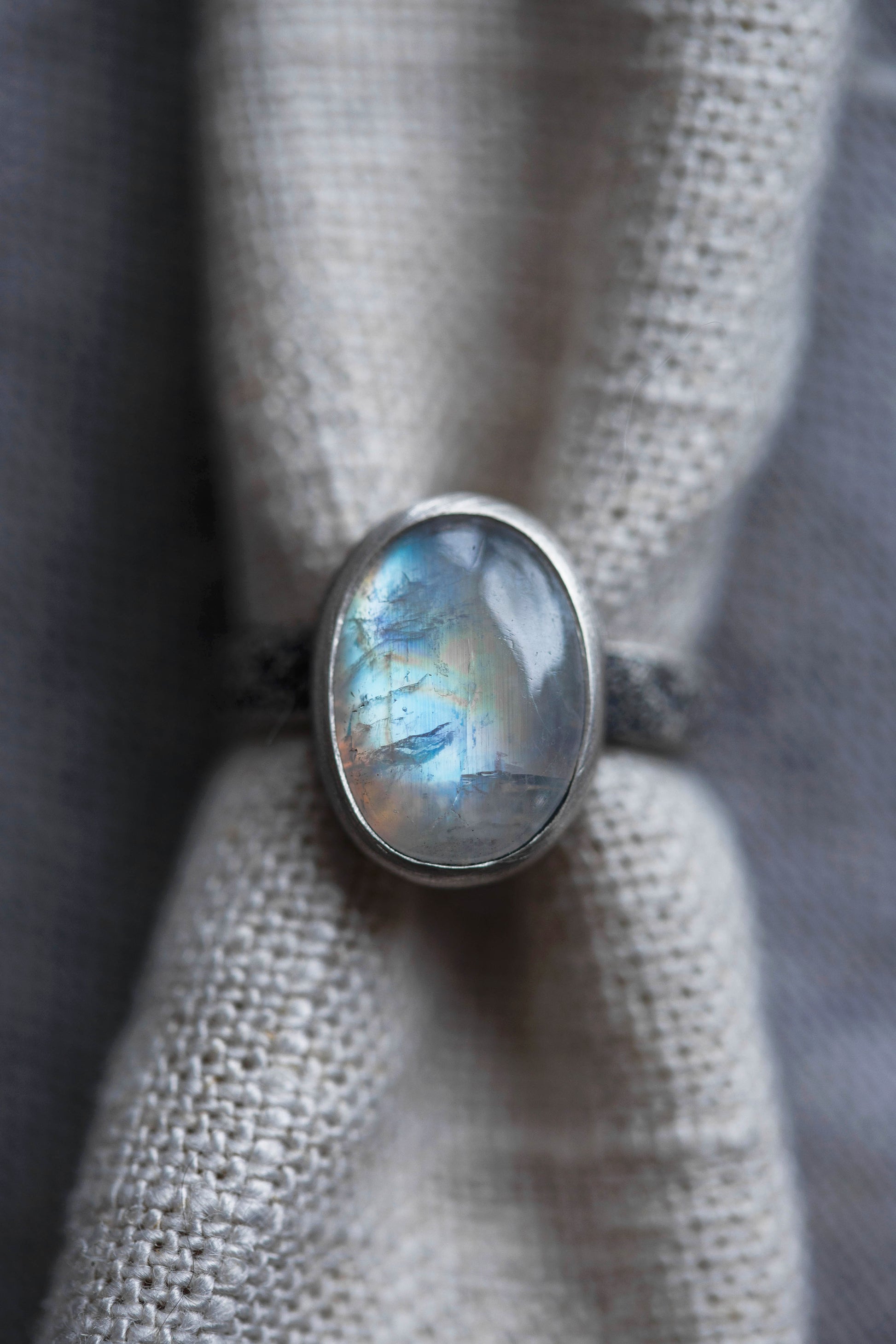 Rings made of shimmering rainbow moonstone in a range of shapes and hues, so that you may find the exact ring that sings to you.
