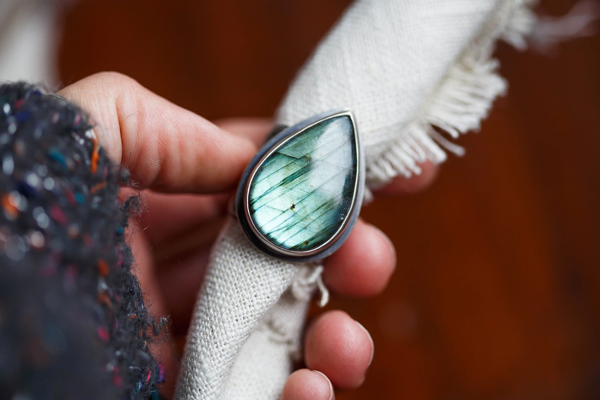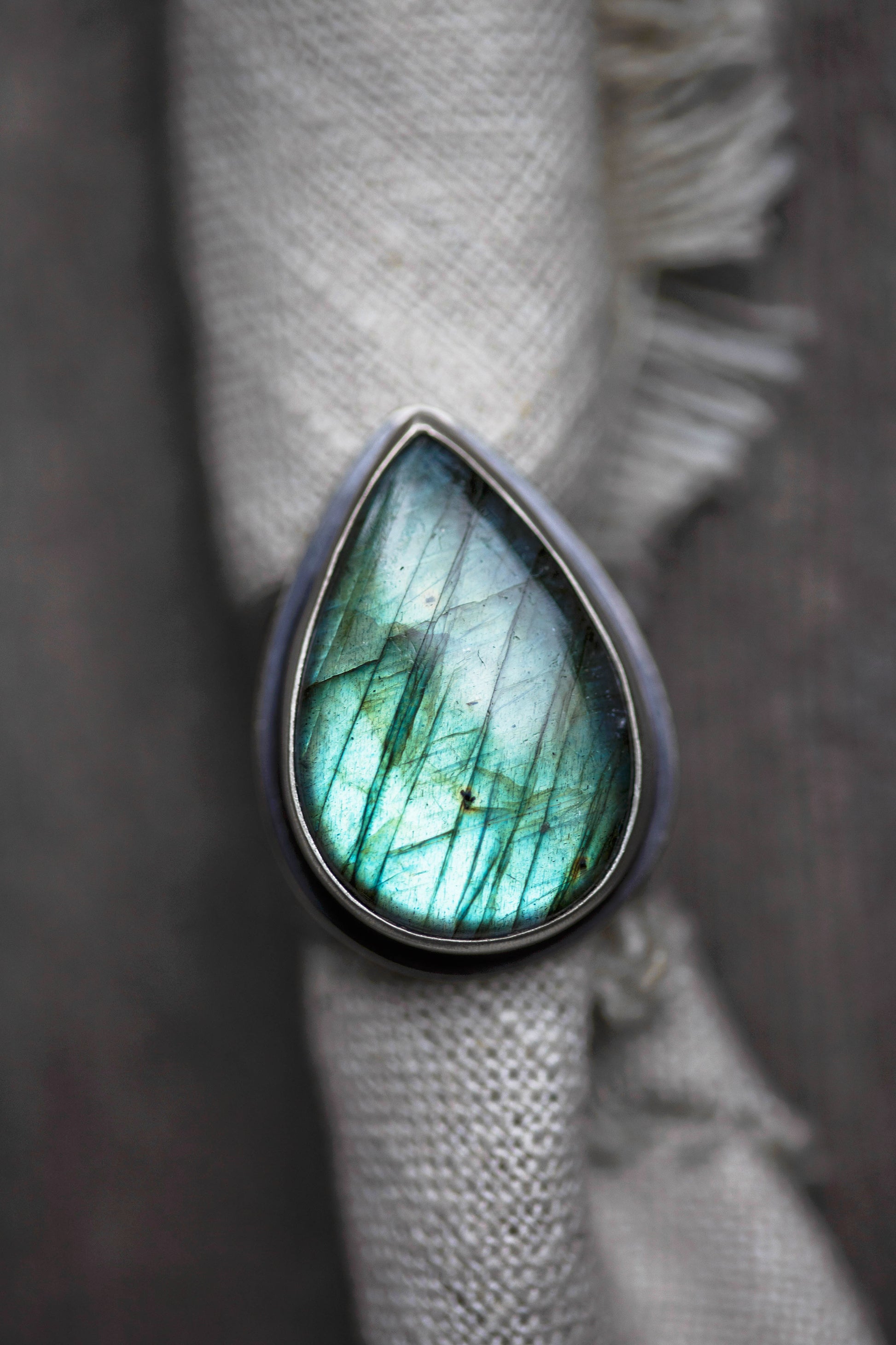 Gemstones are set atop beautifully flared sterling silver ring bands, seemingly spilling around the finger. The band is double-layered for sturdiness and has been given an intricate cobweb patterning.