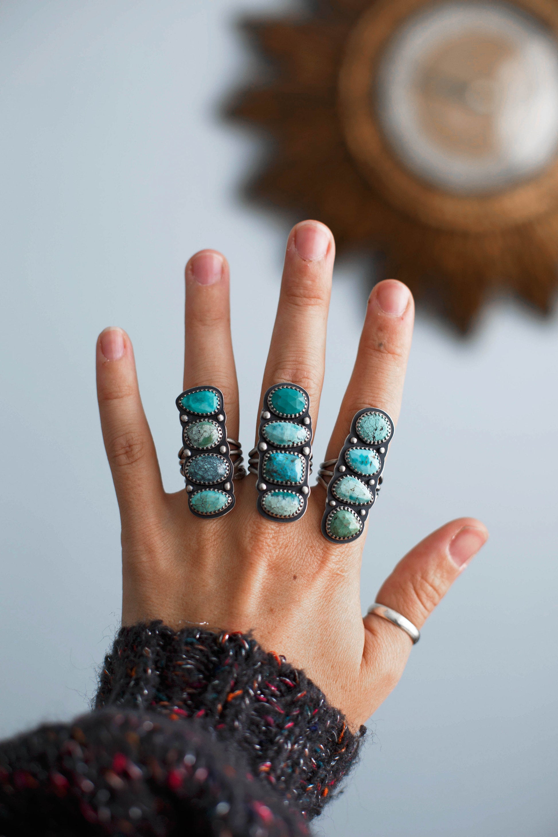 These rings are made from an assortment of turquoise gemstones, each ring featuring an entirely unique collection. Some are smooth, others are faceted. There are soft greens and saturated blues.