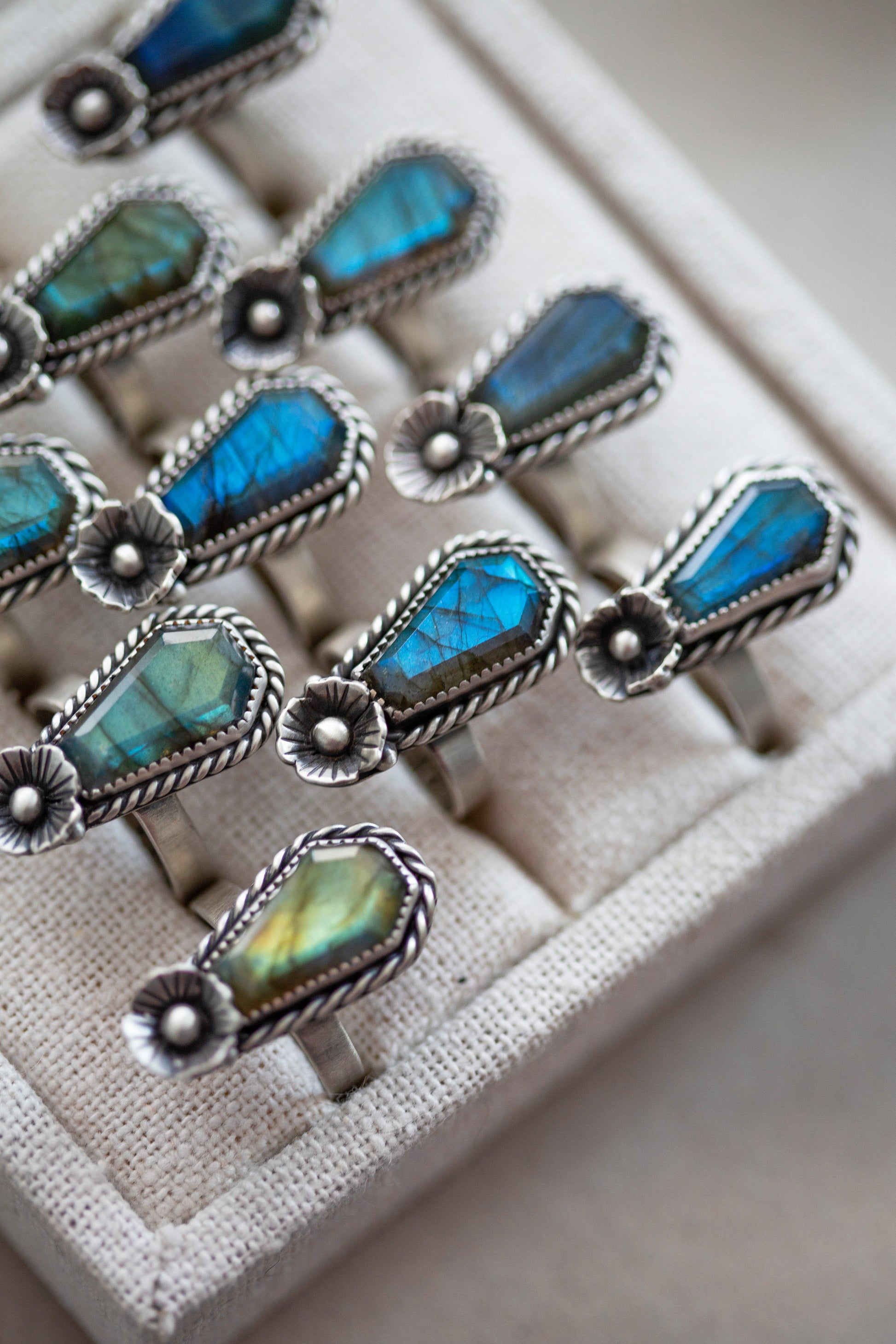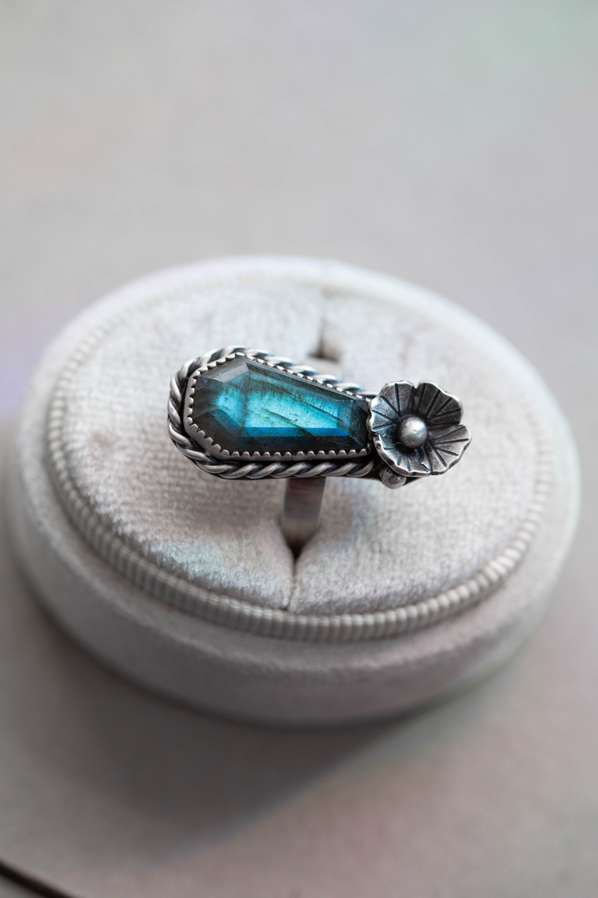 This ring consists of special coffin cut labradorites, single leafy poppies laid at the foot of the graves (the poppy means “peace in death”), viney twist borders wrapping its way around the stones (nature’s reclamation), and the words “memento mori” inscribed on the backs of the pendants and the insides of the rings.
