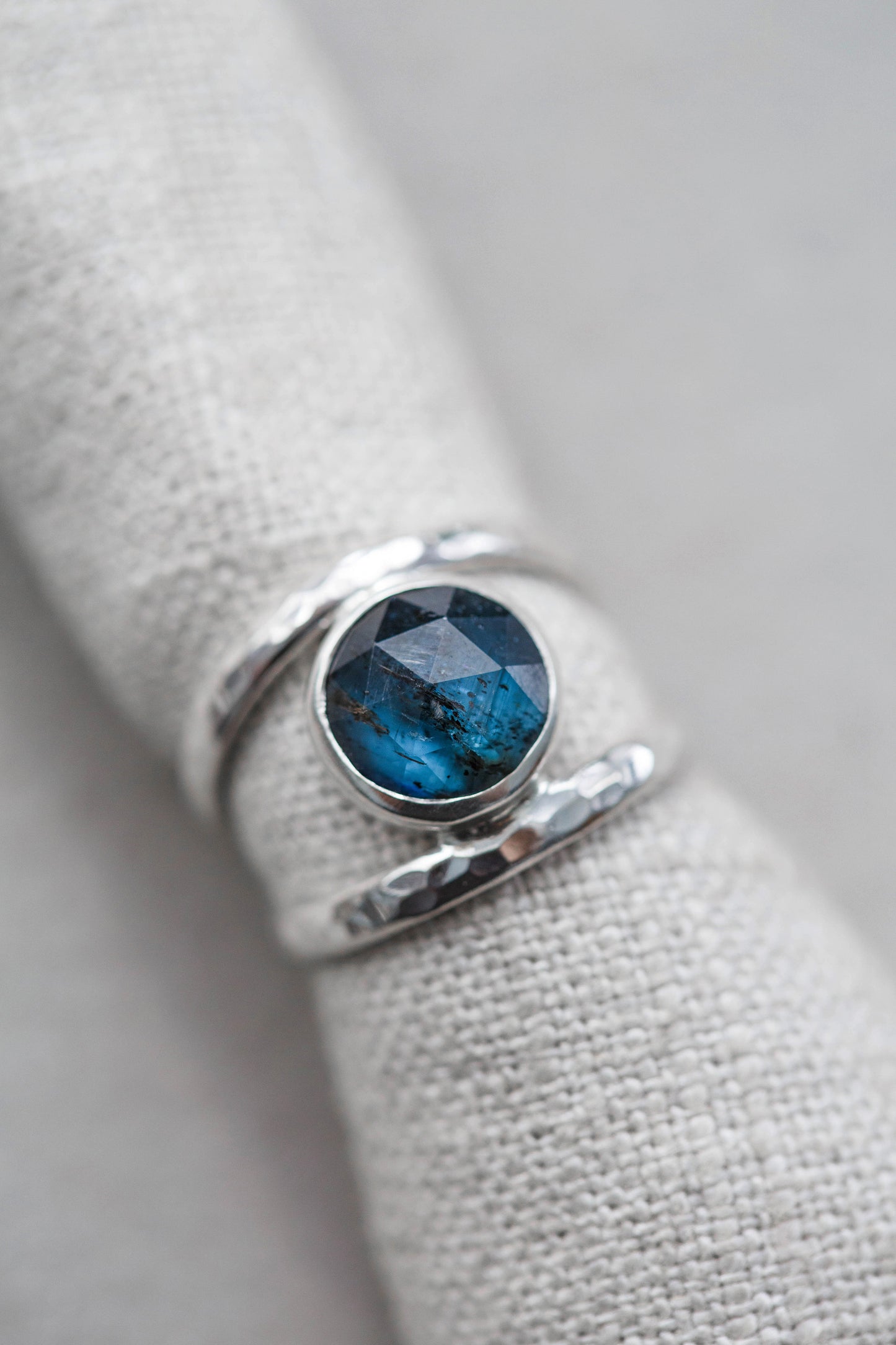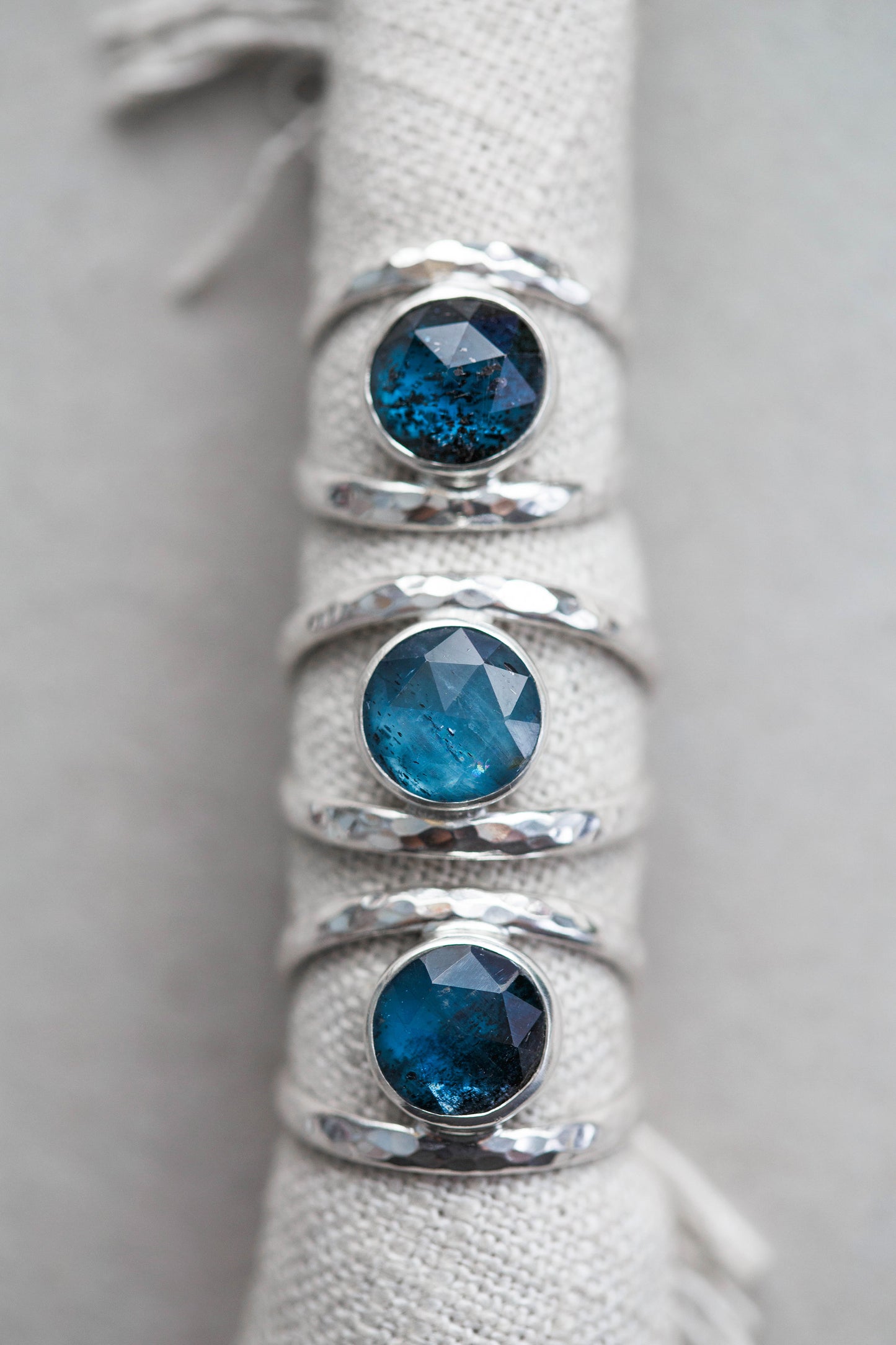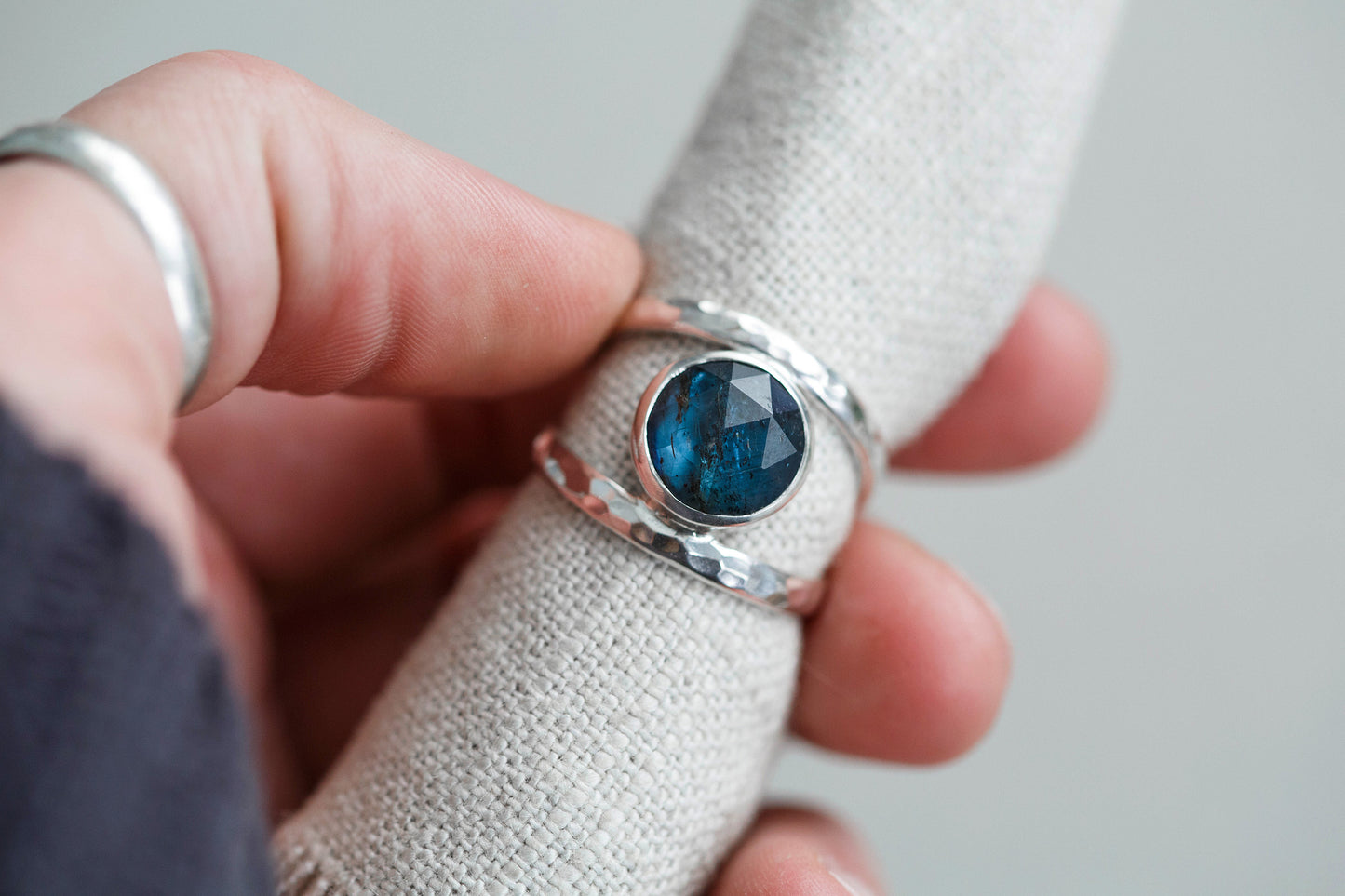 The teal blue kyanite gemstone drinks the light and holds it within. Looking into the stone is like looking up towards the light while underwater, dotted with crackling striations and dark inclusions like clusters of algae or leaves from nearby trees. Glistening facets refracting and throwing the light, like ripples on water. A ring for exploring ocean coves still sparkling with sea ice. A ring for the deep Atlantic, all saturated blues and shadows. A ring for mermaids and wave-walkers, ocean explorers with hearts made of sea salt.