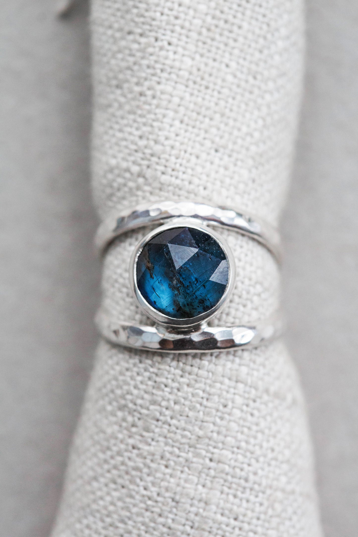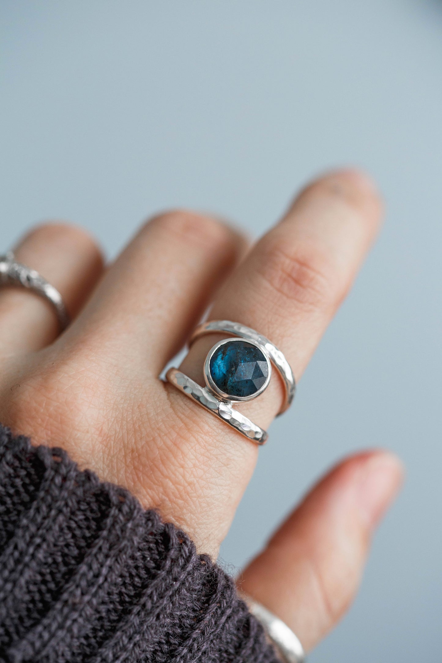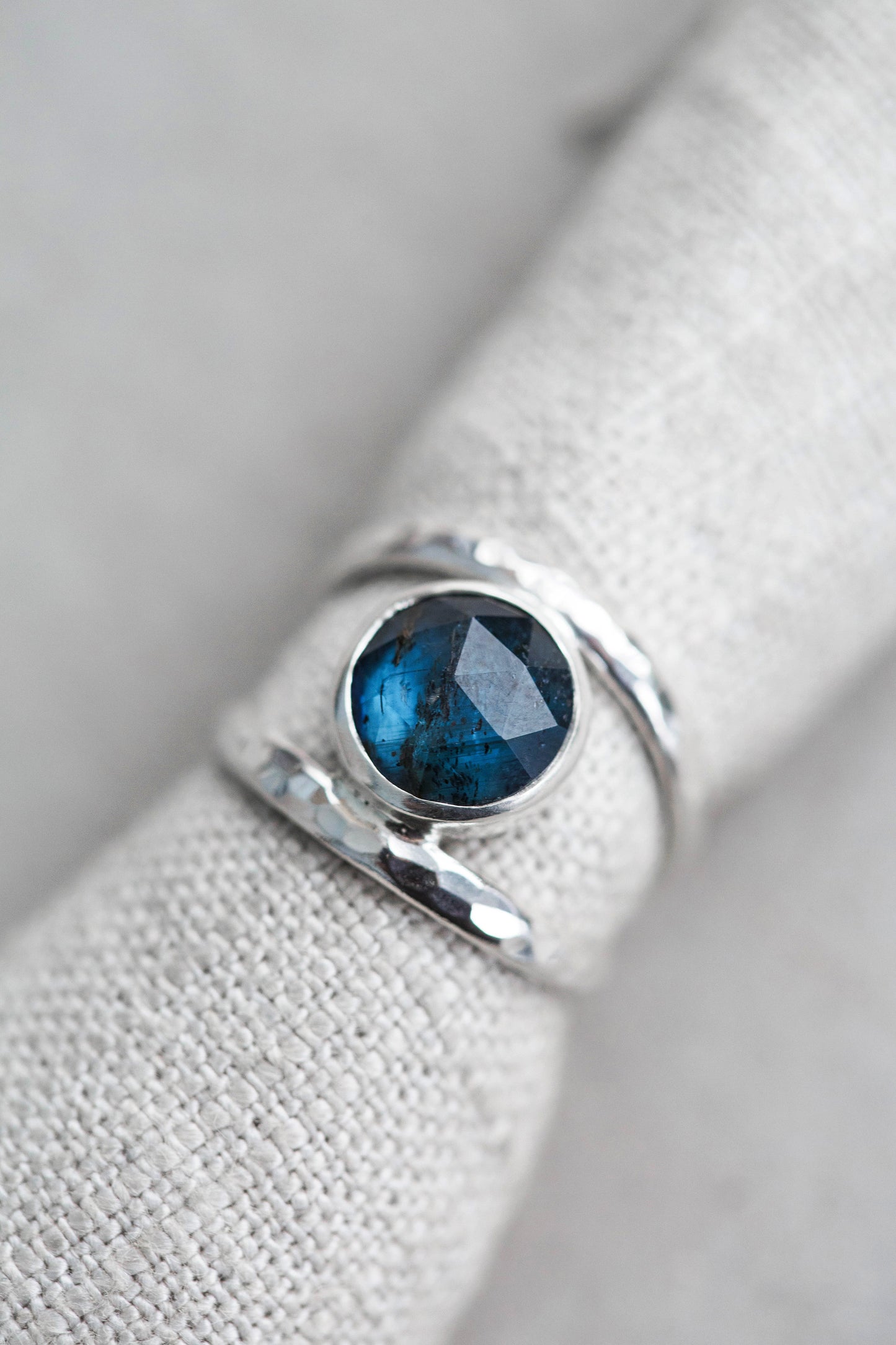 The teal blue kyanite gemstone drinks the light and holds it within. Looking into the stone is like looking up towards the light while underwater, dotted with crackling striations and dark inclusions like clusters of algae or leaves from nearby trees. Glistening facets refracting and throwing the light, like ripples on water. A ring for exploring ocean coves still sparkling with sea ice. A ring for the deep Atlantic, all saturated blues and shadows. A ring for mermaids and wave-walkers, ocean explorers with hearts made of sea salt.