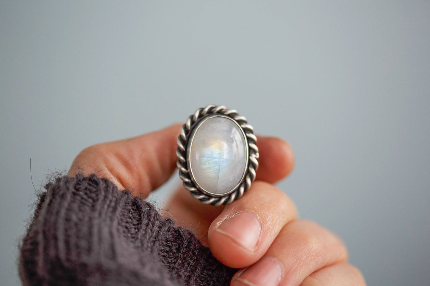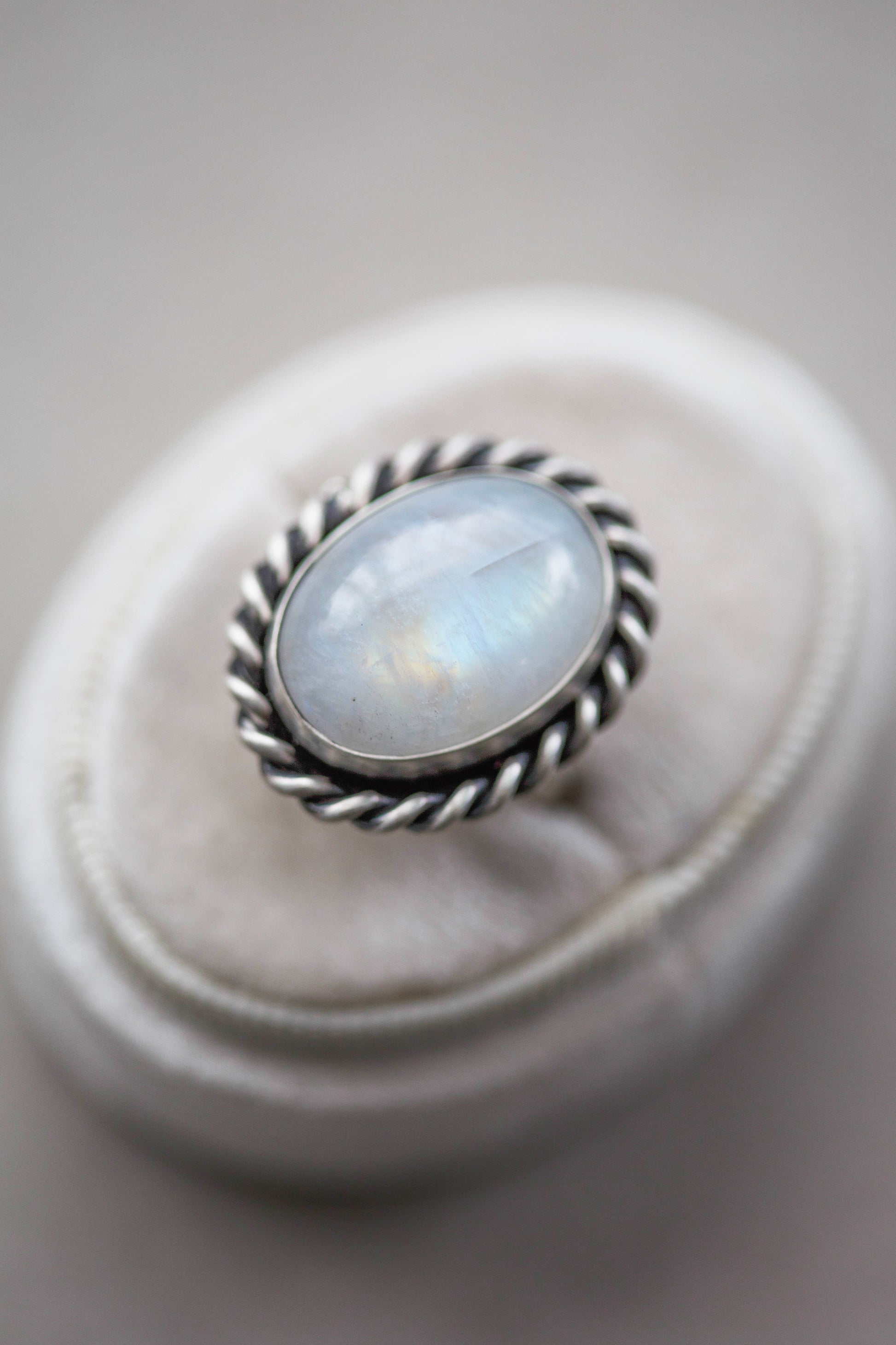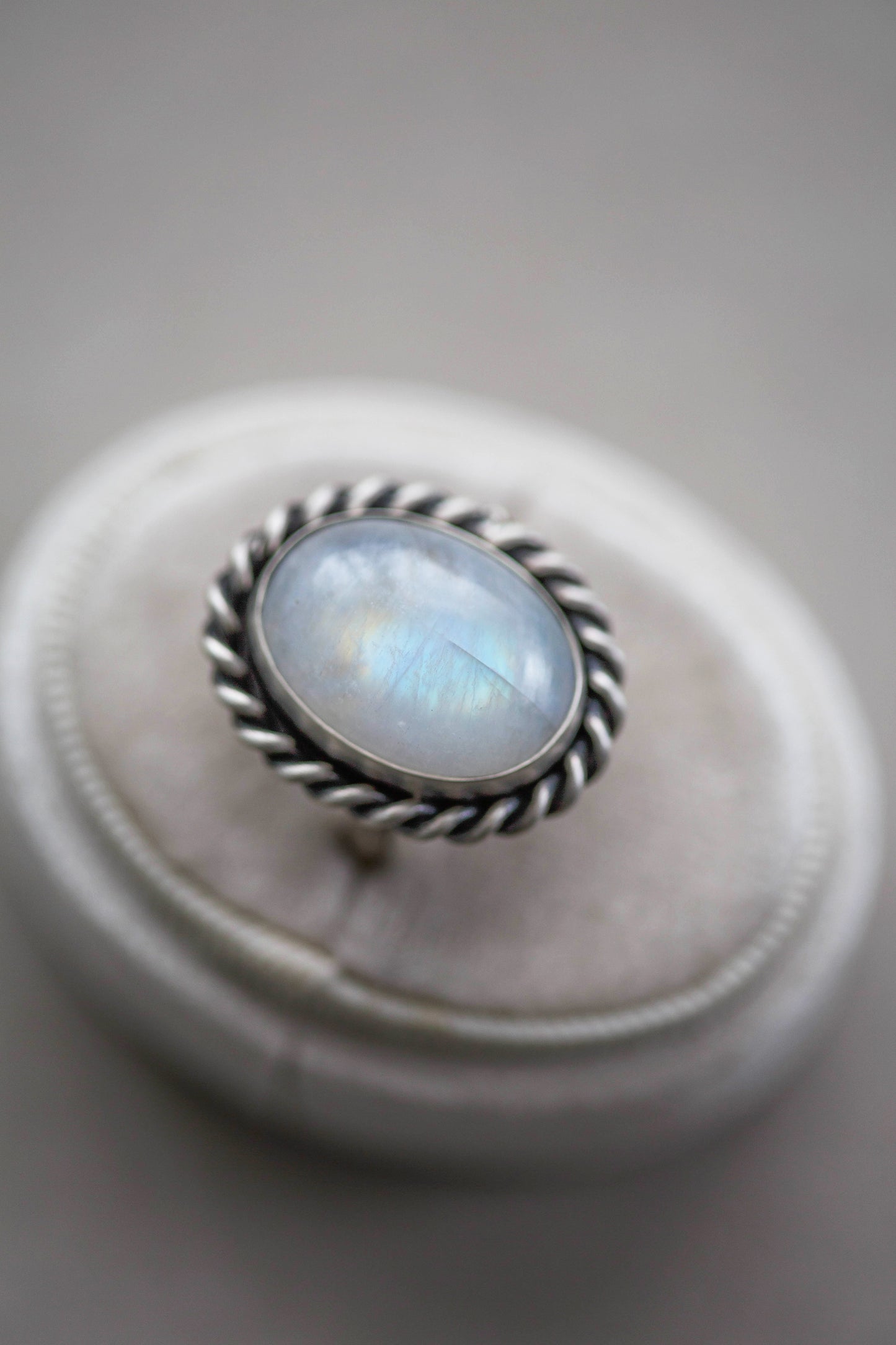 A magical rainbow moonstone set in a straight bezel, surrounded by a romantic hand-twisted accent. It has then been oxidized and polished to highlight the flash of the stone.