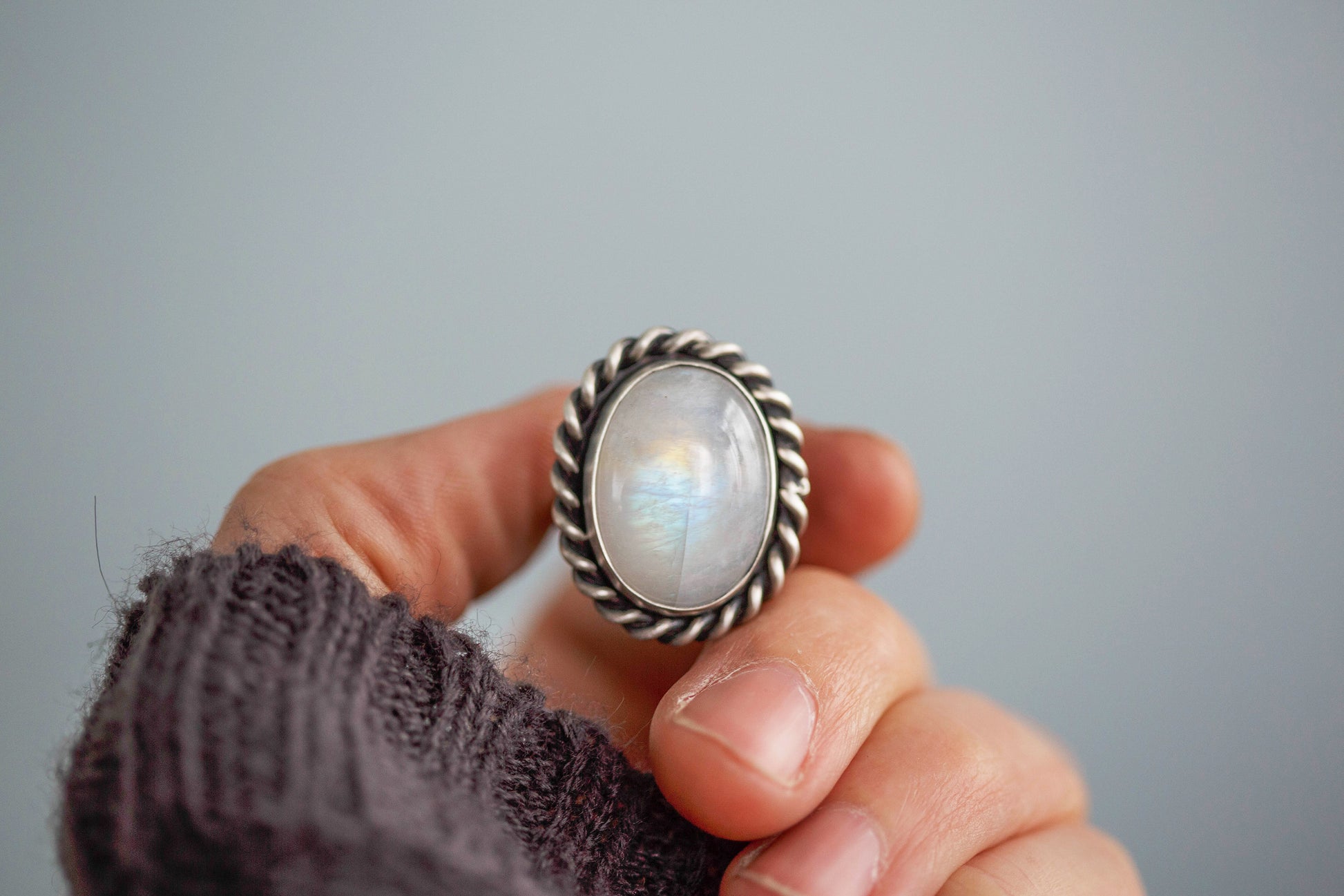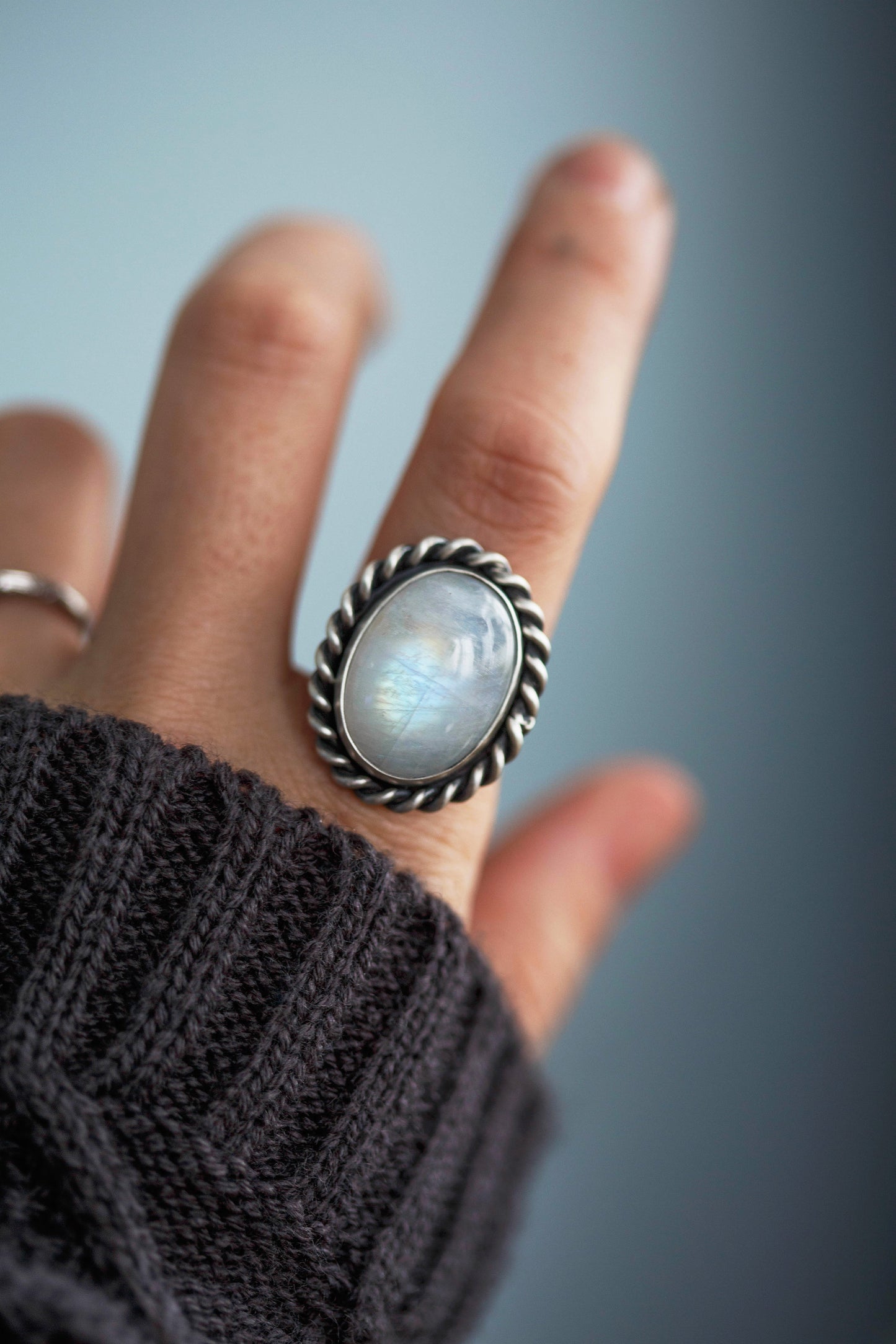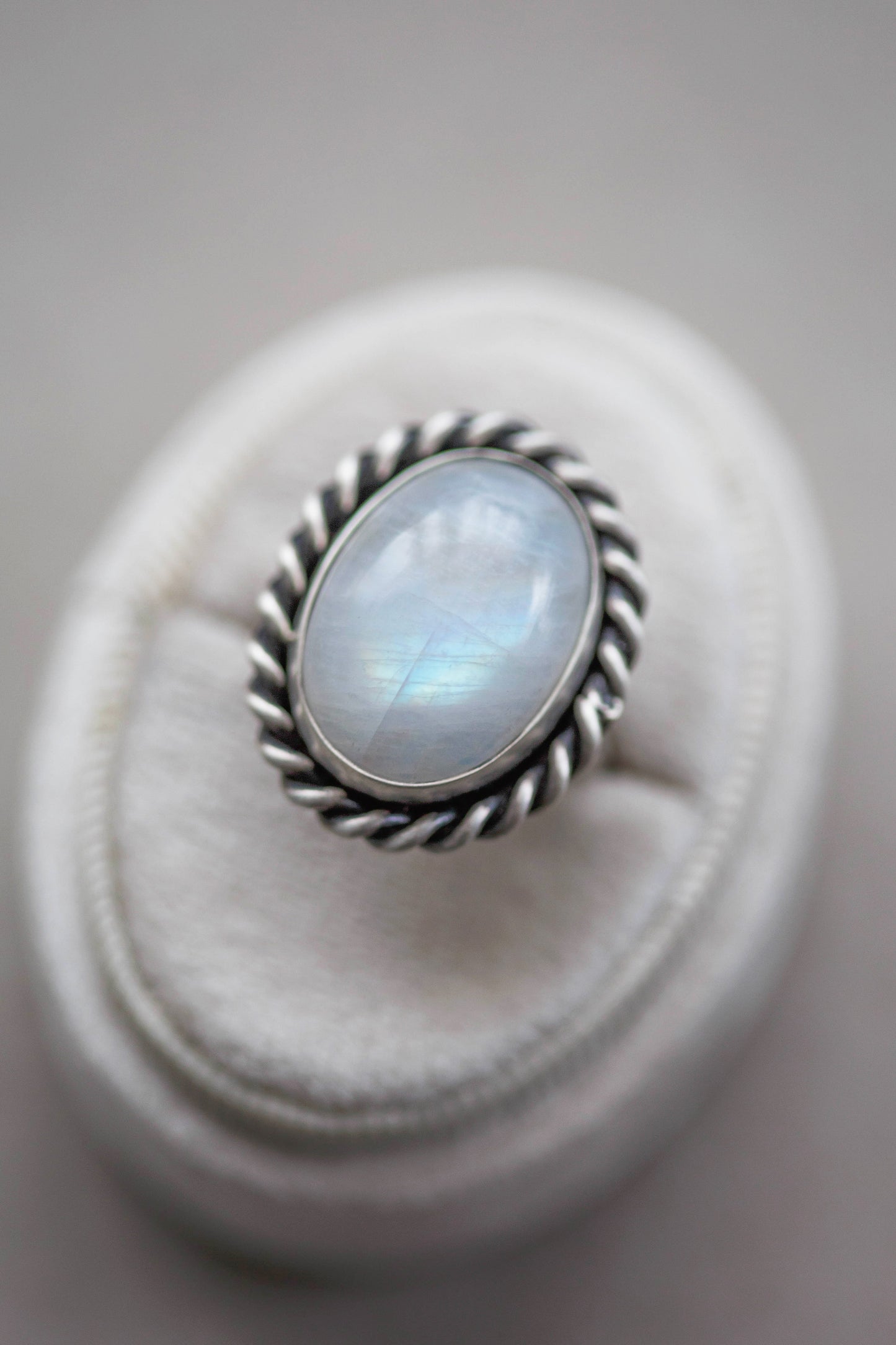 A magical rainbow moonstone set in a straight bezel, surrounded by a romantic hand-twisted accent. It has then been oxidized and polished to highlight the flash of the stone.