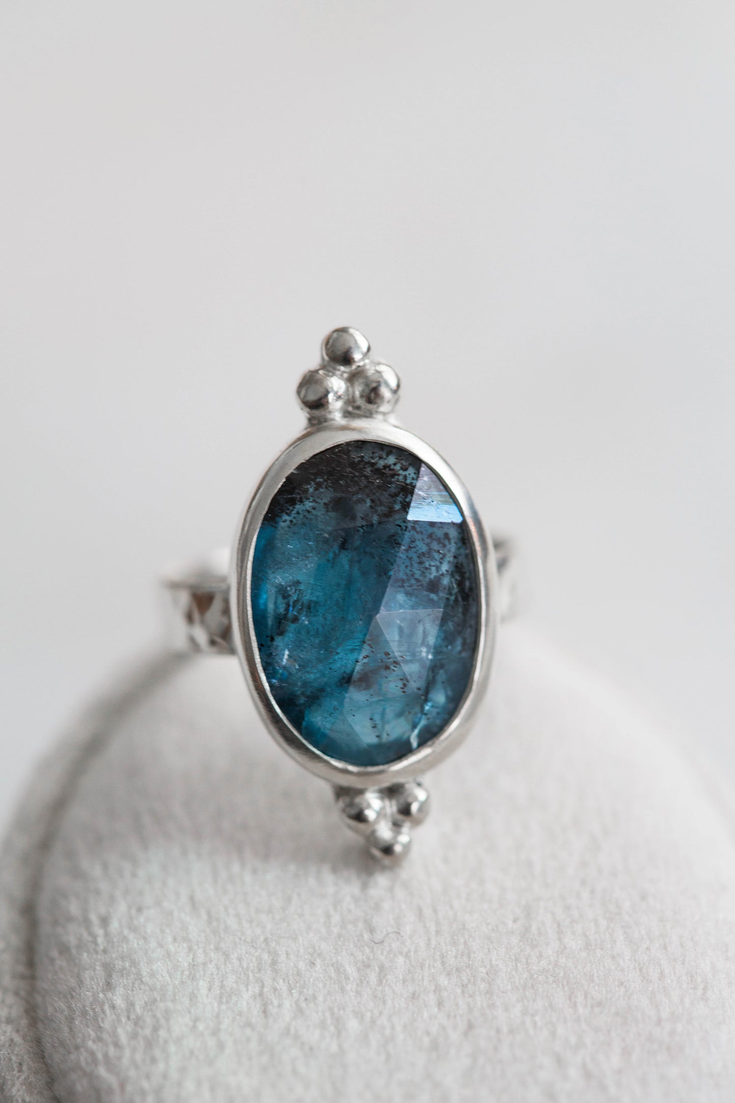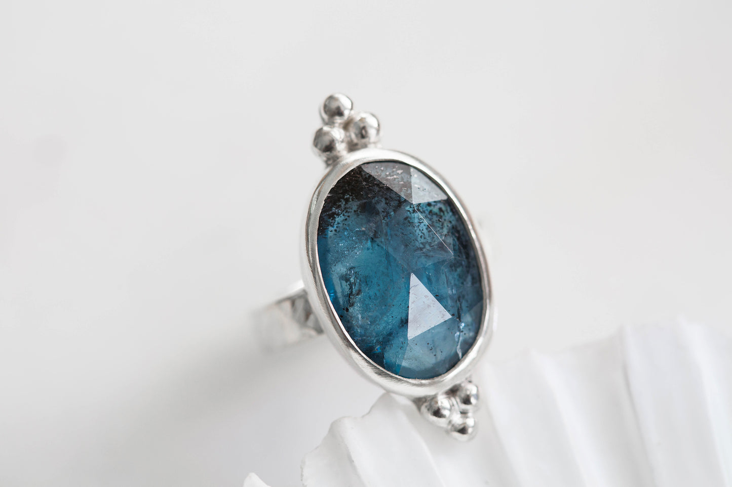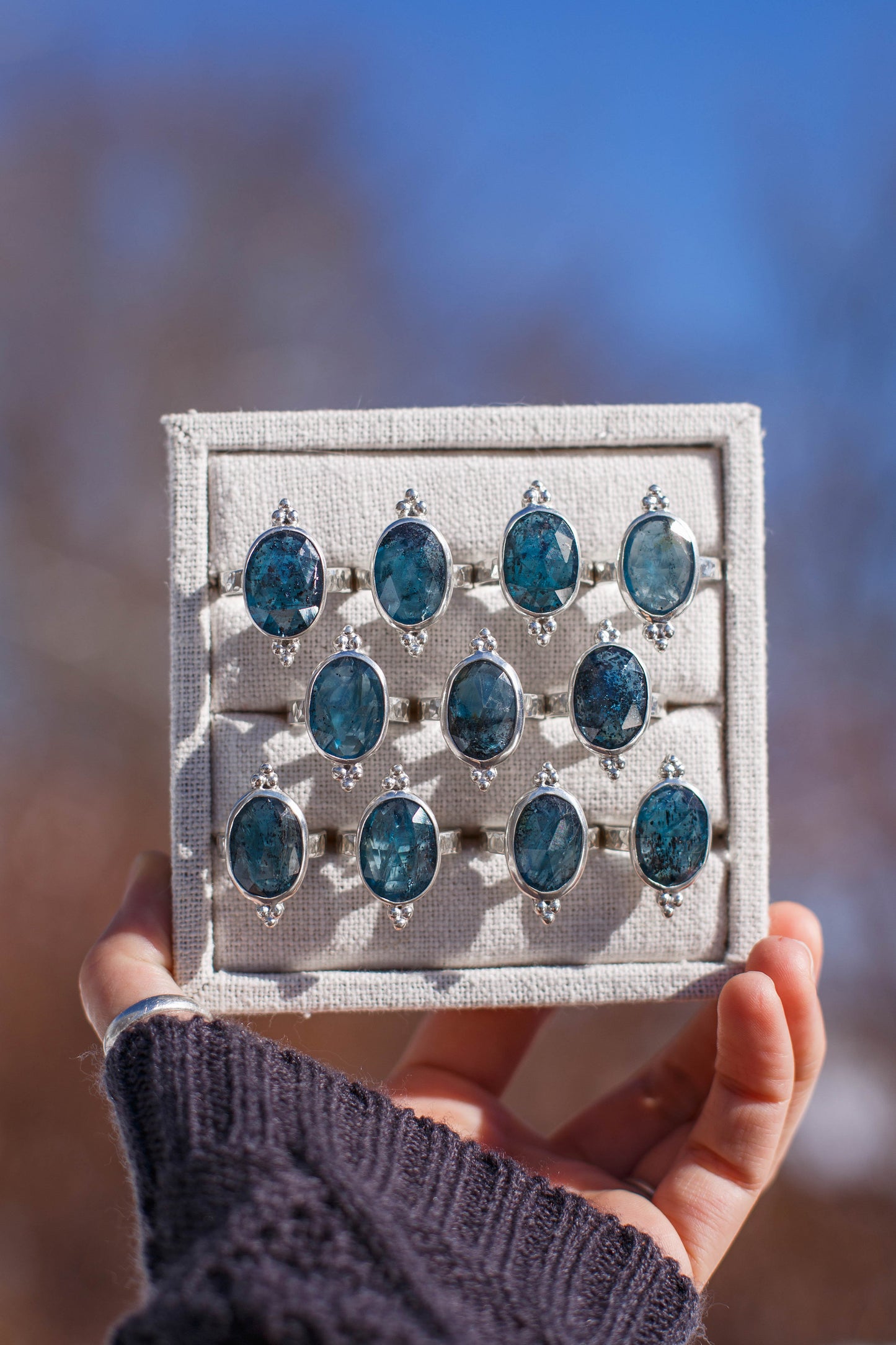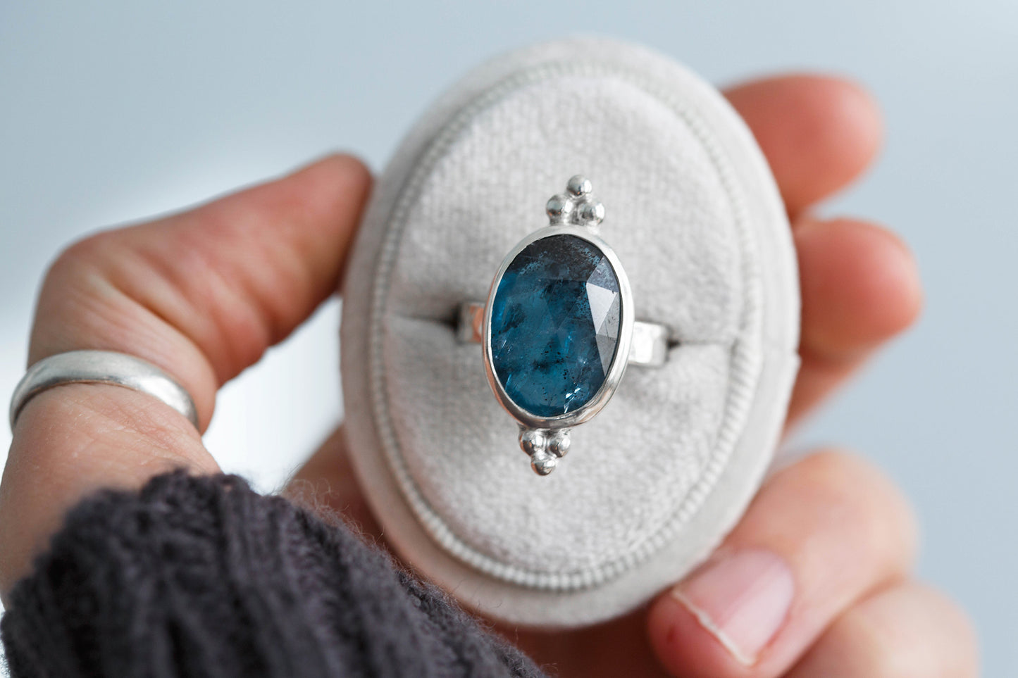 A ring for exploring ocean coves still sparkling with sea ice. A ring for the deep Atlantic, all saturated blues and shadows. A ring for mermaids and wave-walkers, ocean explorers with hearts made of sea salt. The teal blue kyanite gemstone drinks the light and holds it within.