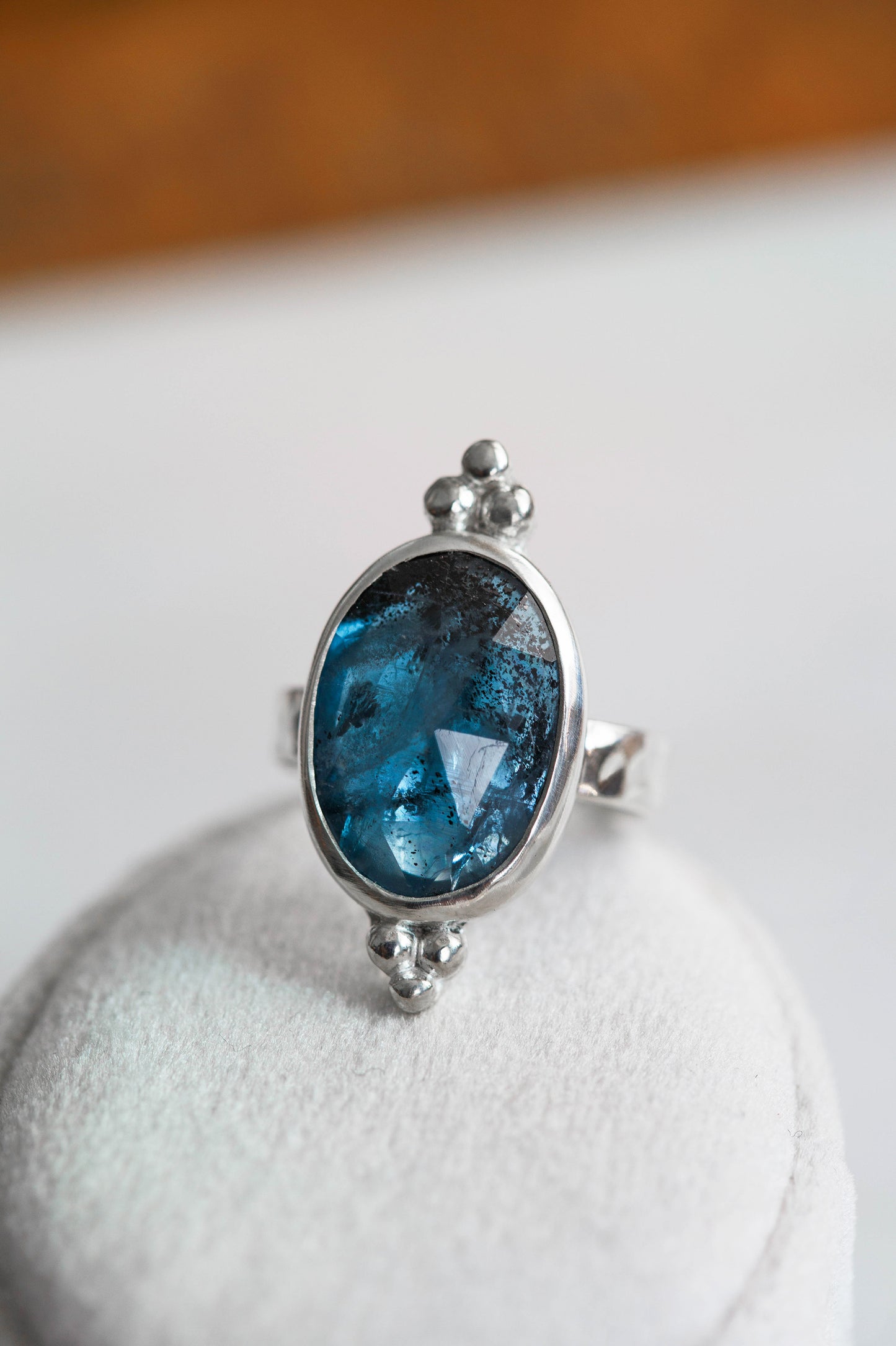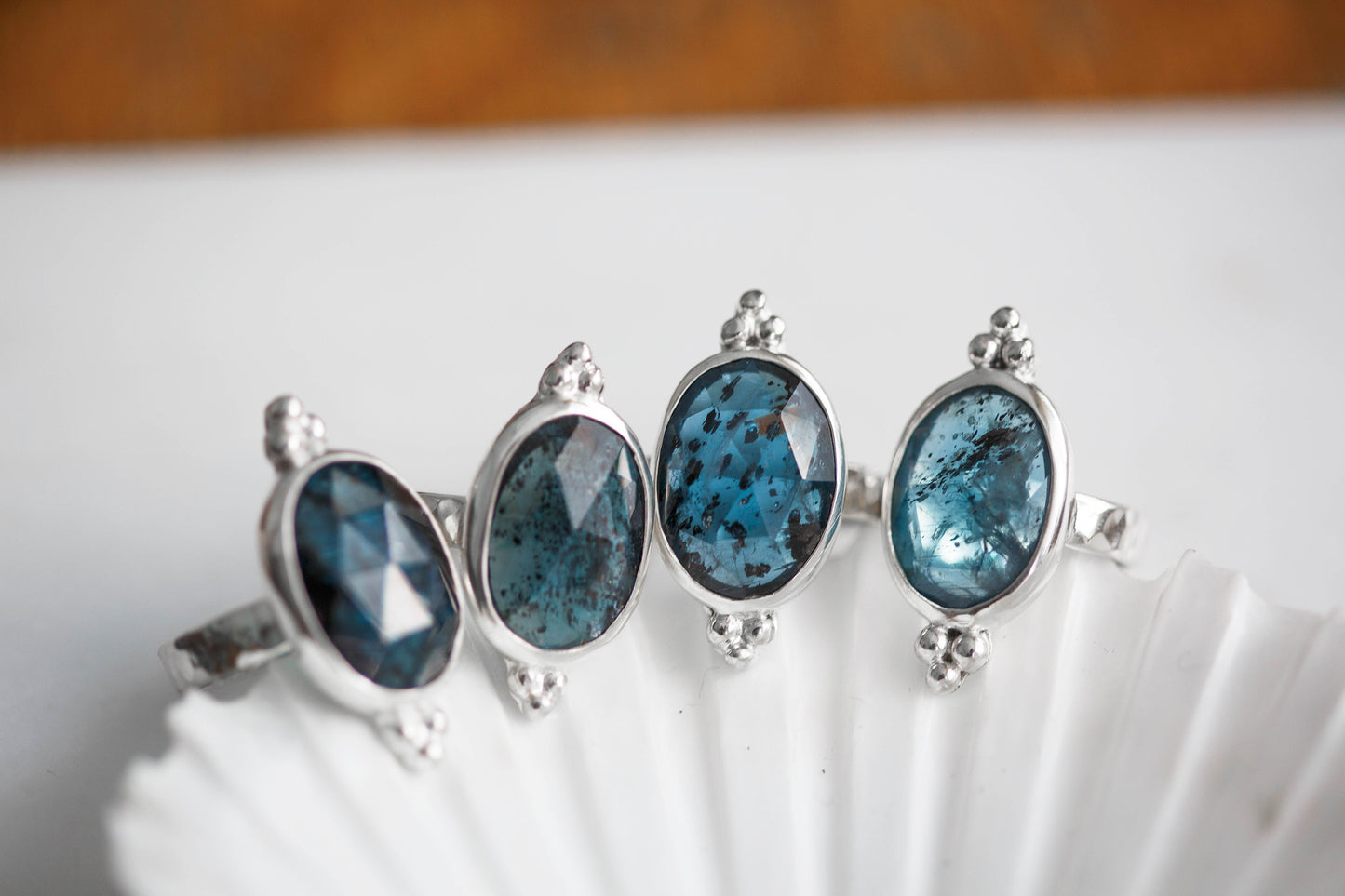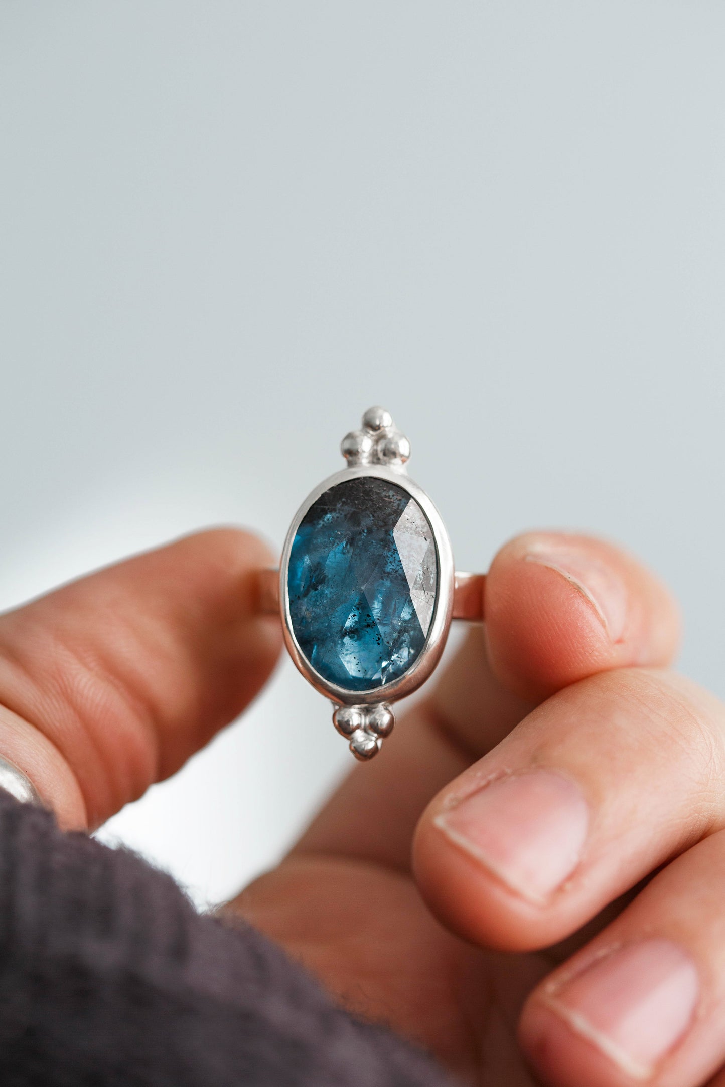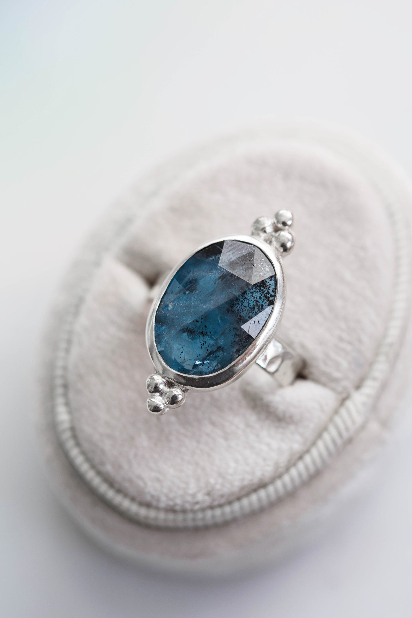 A ring for exploring ocean coves still sparkling with sea ice. A ring for the deep Atlantic, all saturated blues and shadows. A ring for mermaids and wave-walkers, ocean explorers with hearts made of sea salt. The teal blue kyanite gemstone drinks the light and holds it within.