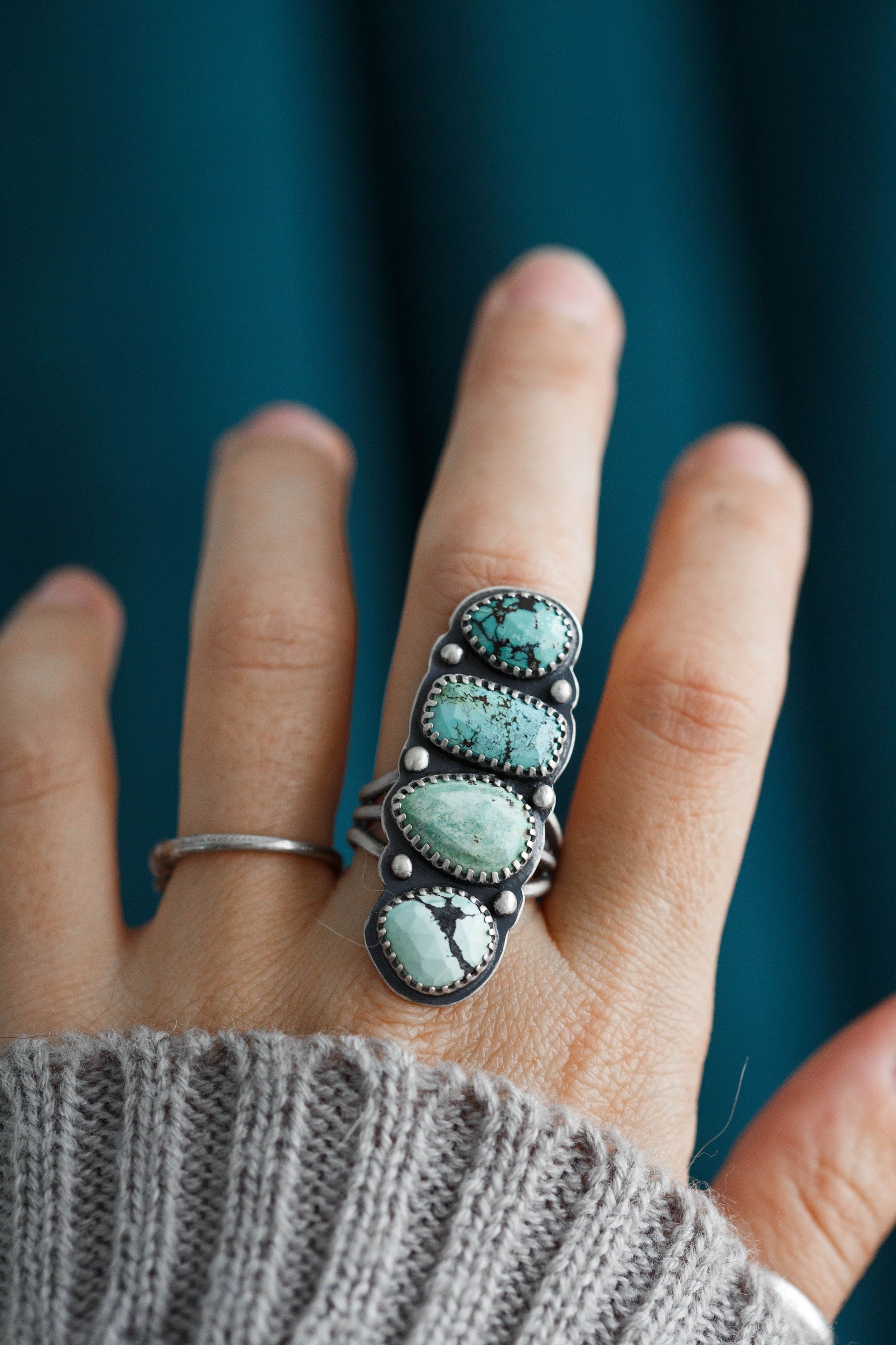 These rings are made from an assortment of turquoise gemstones, each ring featuring an entirely unique collection. Some are smooth, others are faceted. There are soft greens and saturated blues.