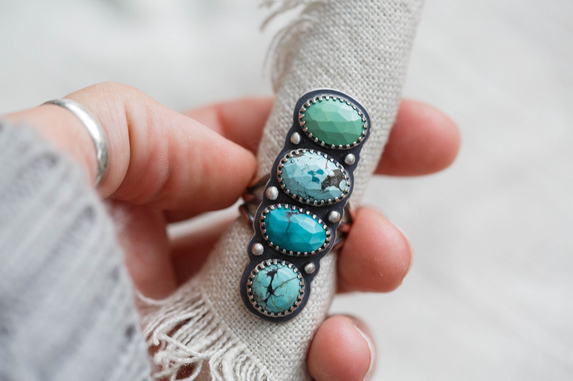 These rings are made from an assortment of turquoise gemstones, each ring featuring an entirely unique collection. Some are smooth, others are faceted. There are soft greens and saturated blues.