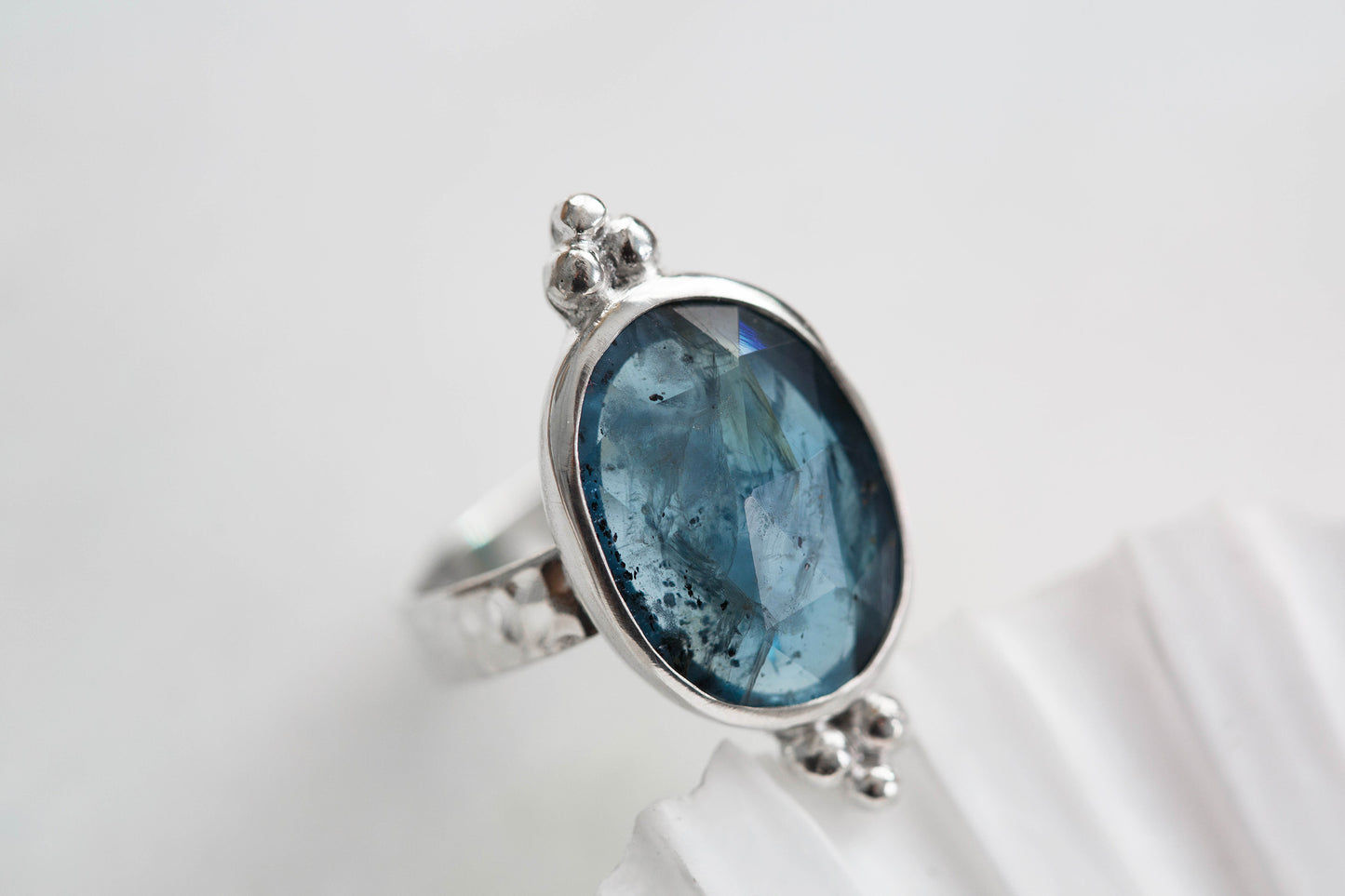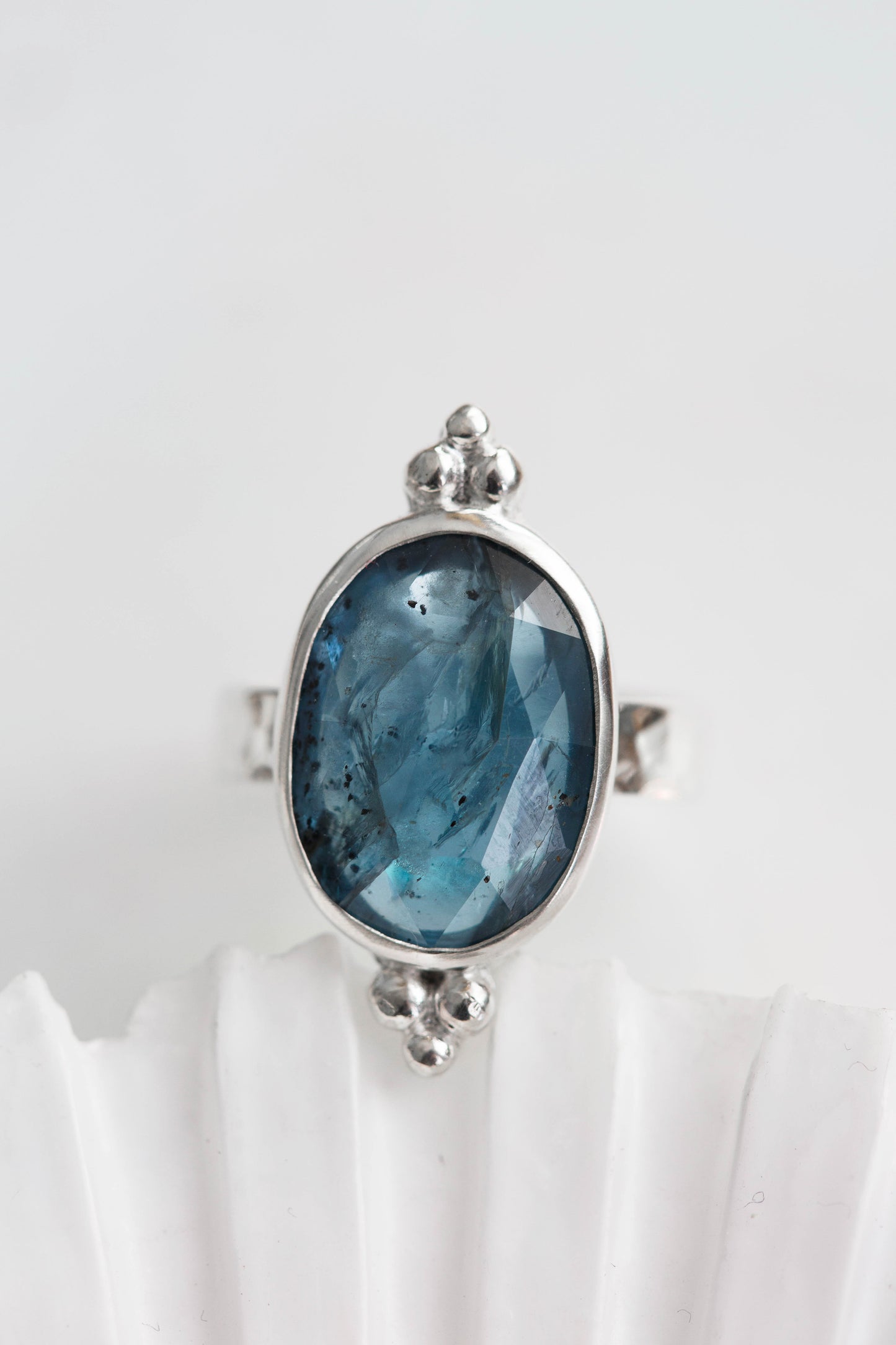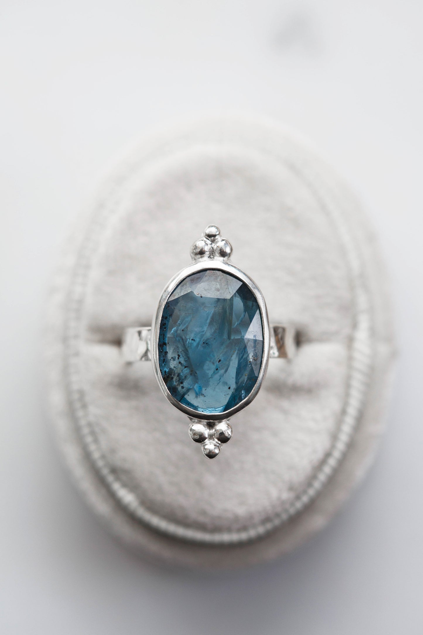 A ring for exploring ocean coves still sparkling with sea ice. A ring for the deep Atlantic, all saturated blues and shadows. A ring for mermaids and wave-walkers, ocean explorers with hearts made of sea salt. The teal blue kyanite gemstone drinks the light and holds it within.
