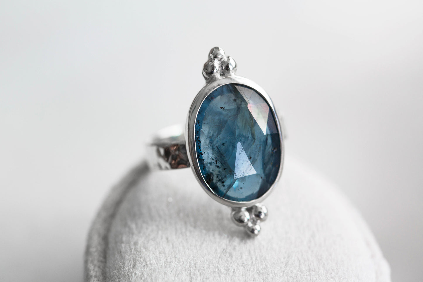 This ring is made from a natural, teal kyanite gemstone stone set in a straight bezel. Accenting the stone are two clusters of three silver pebbles, like beach stones smooth and shining from a recent wave.