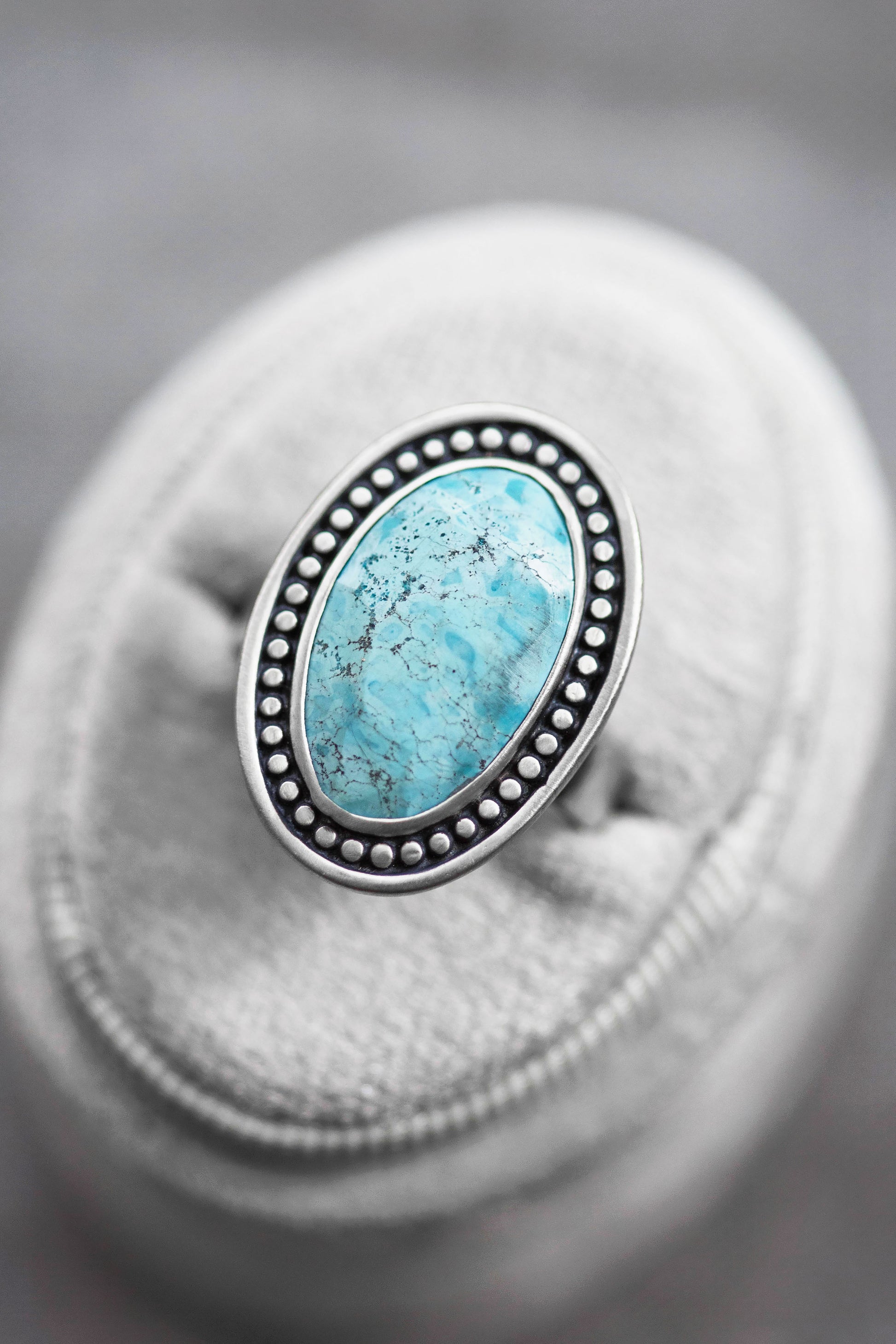 These rings are made with turquoise gemstones that are quite varied. There are rectangles and ovals and freeform stones, some that are light blue and others that are dark green. Some with silky uniform coloring and others with fascinating matrices.