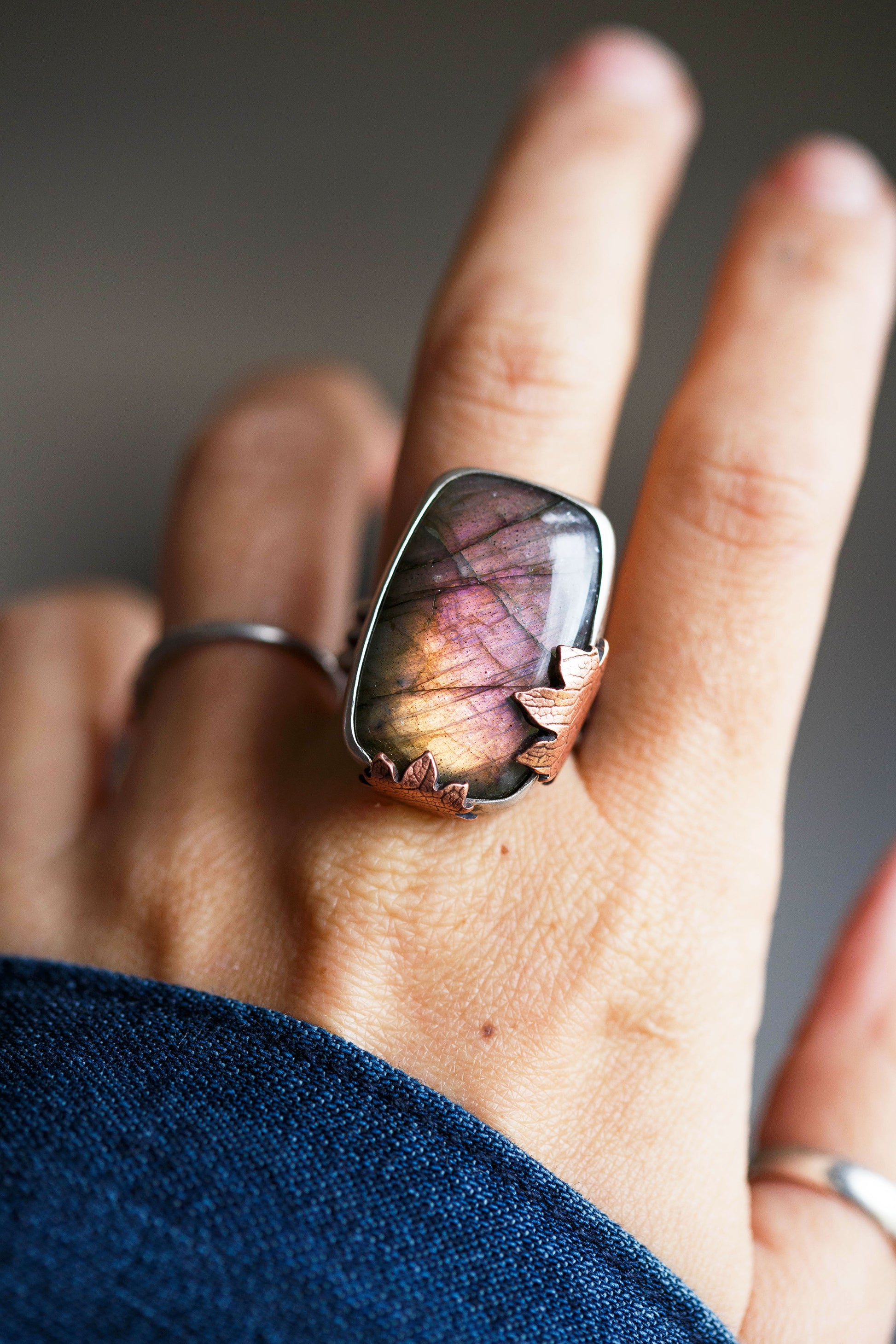 This ring design consists of beautiful labradorites, ranging from deep blues to snakey greens to crackling golds to soft purples. Some have a soft, smokey surface where to color is furtive and secretive. Others have a color that is bright and searing. Some gemstones are striated with surface imperfections, and others are smooth and liquidy.
