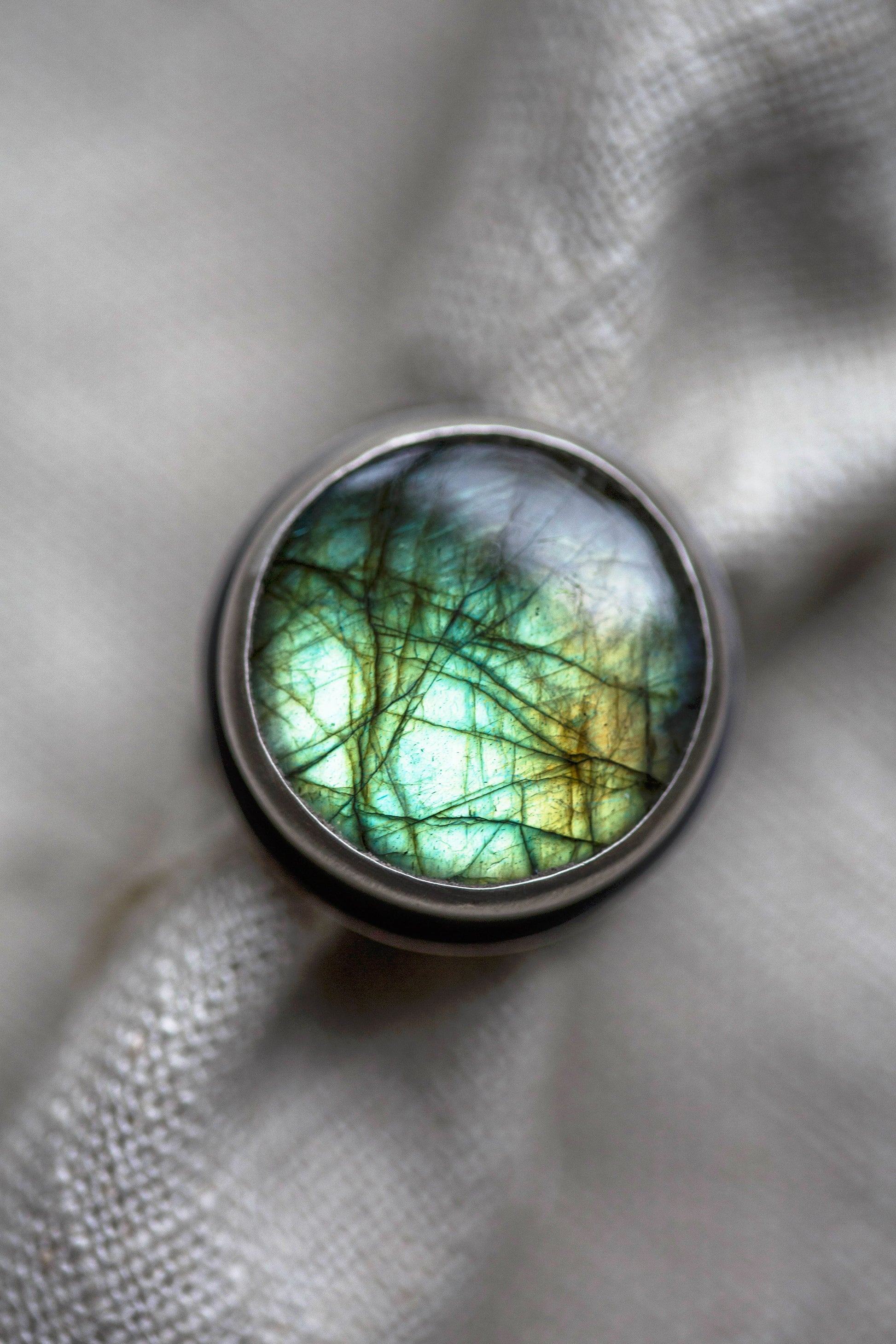 This design consists of rare colors of labradorites, ranging from purple to orange to a rainbow spectrum.