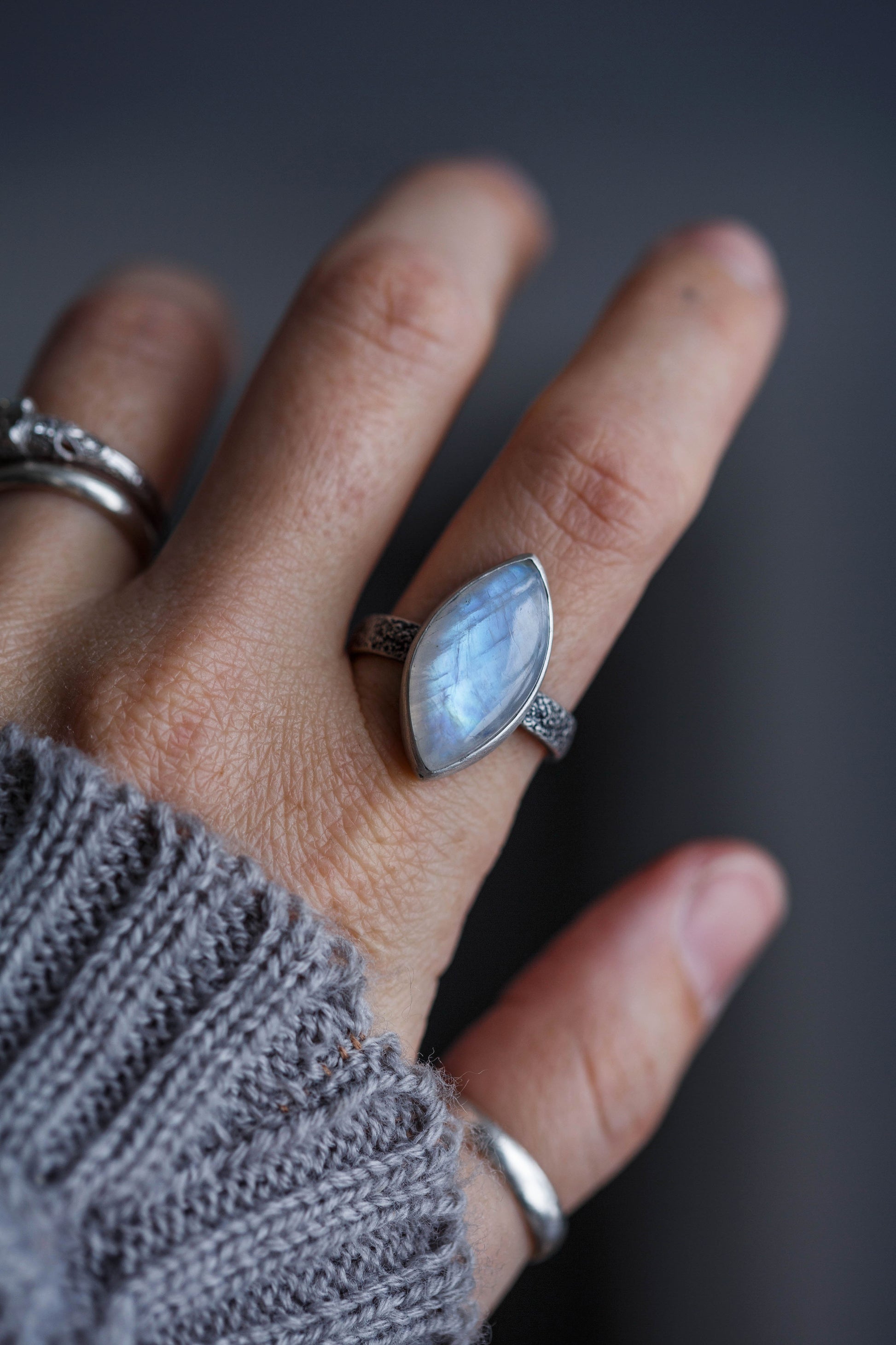 Rings made of shimmering rainbow moonstone in a range of shapes and hues, so that you may find the exact ring that sings to you.