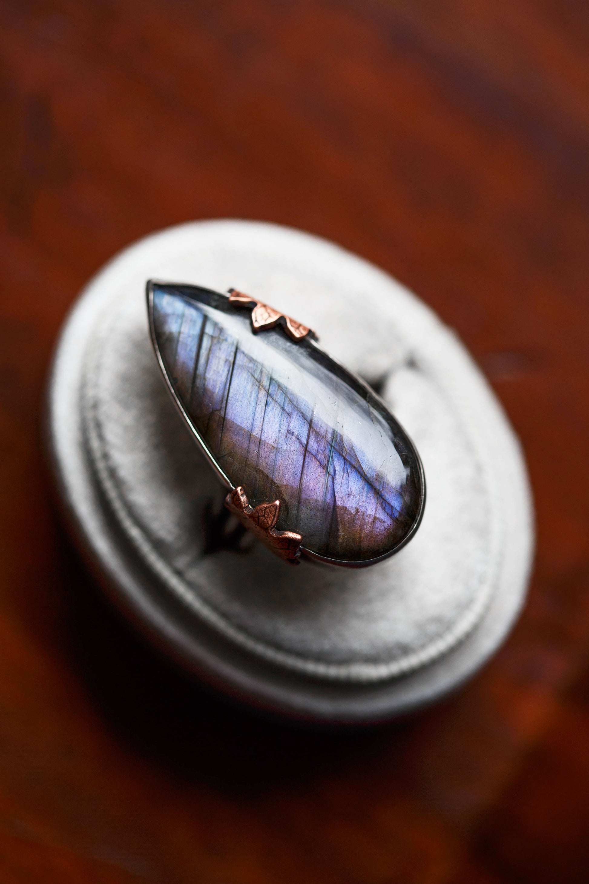 Gently hugging the labradorites are sweet little copper leaves with leaf-print taken from real leaves.