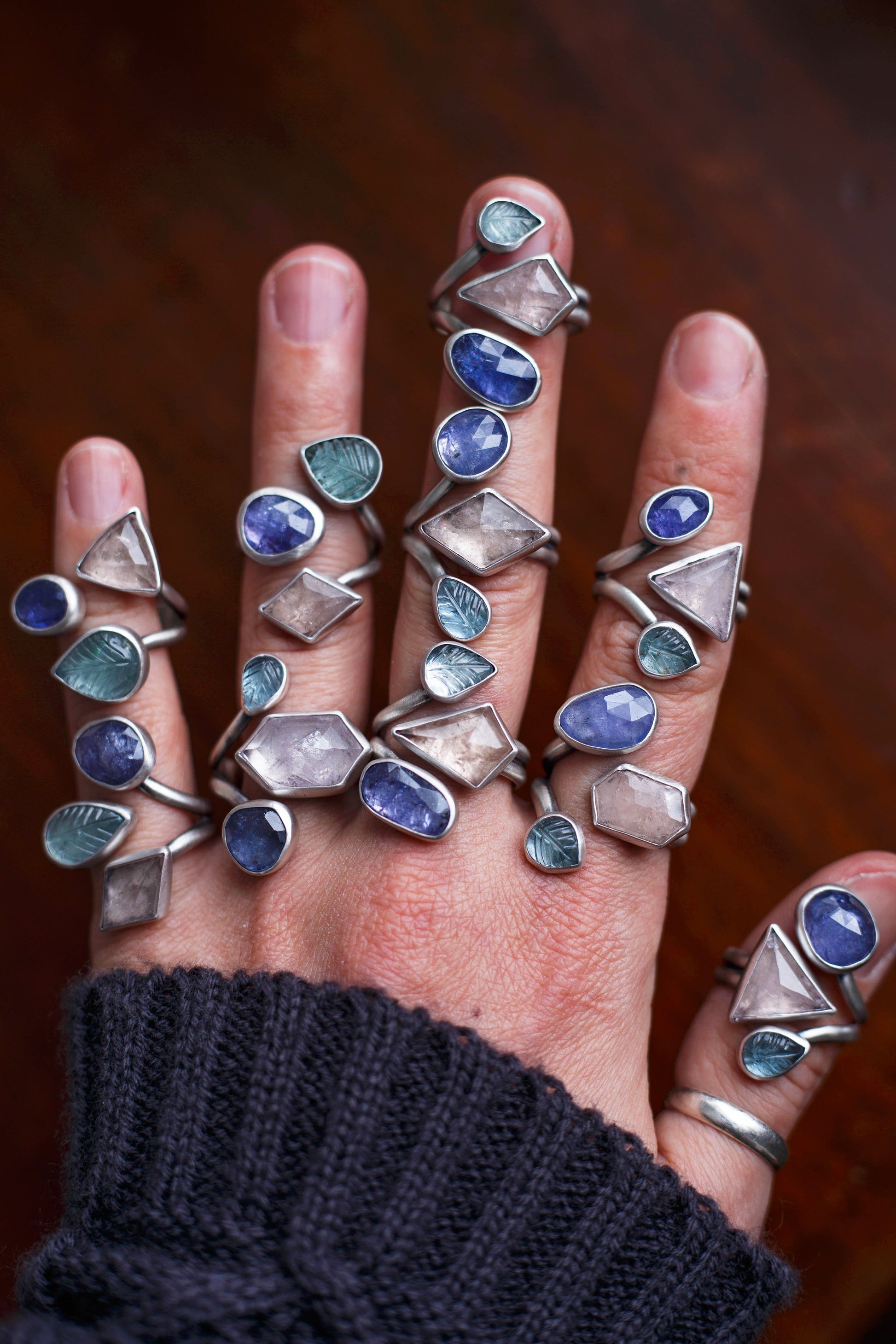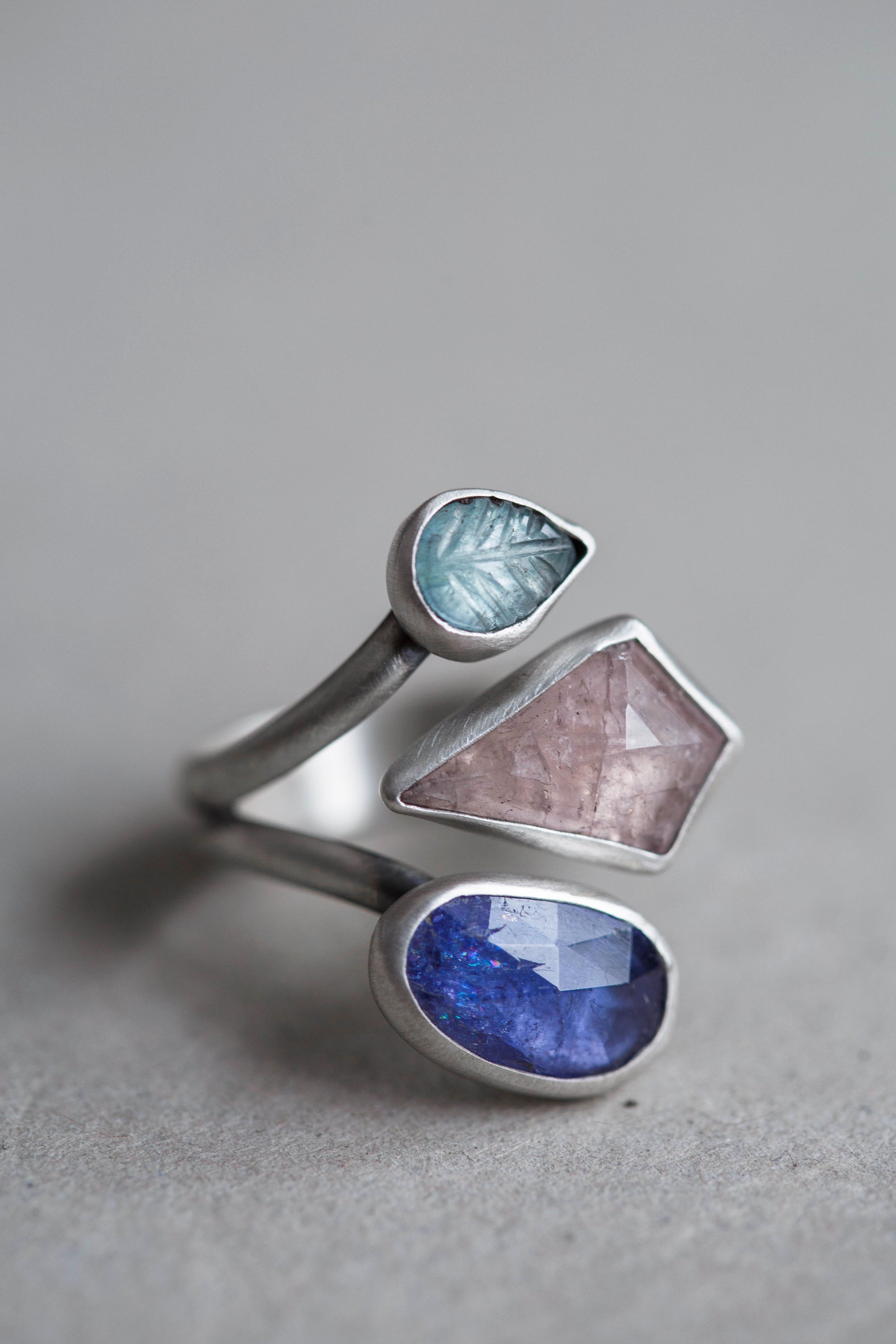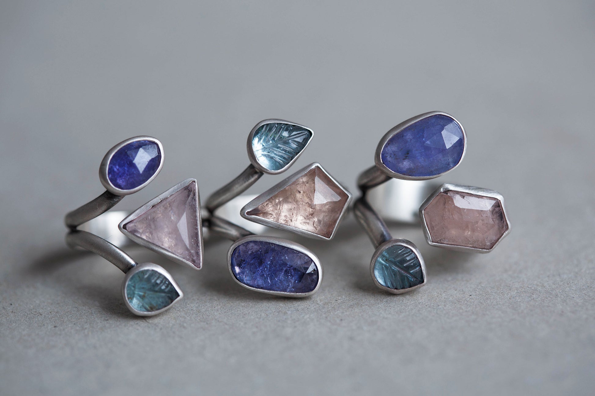 These rings each feature varying clusters of gemstones, most of which are unique cuts and feature surface imperfections. Heavily crackled pink morganites, the softest pink in all its icy beauty, in some bold and unusual cuts. Tanzanites, with their ever-soothing hues. And the tiniest aquamarines carved into little leaves, the ephemeral made everlasting.