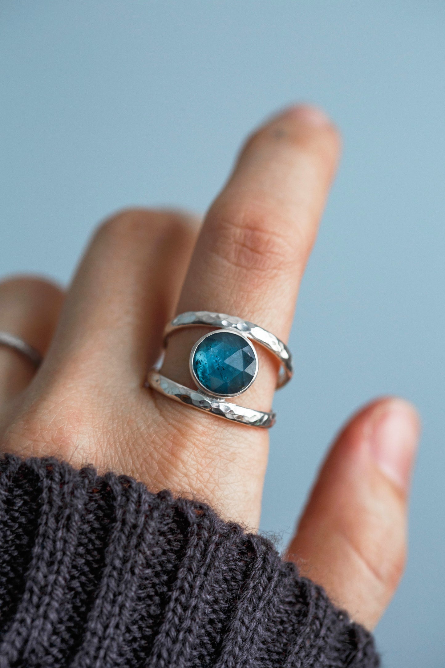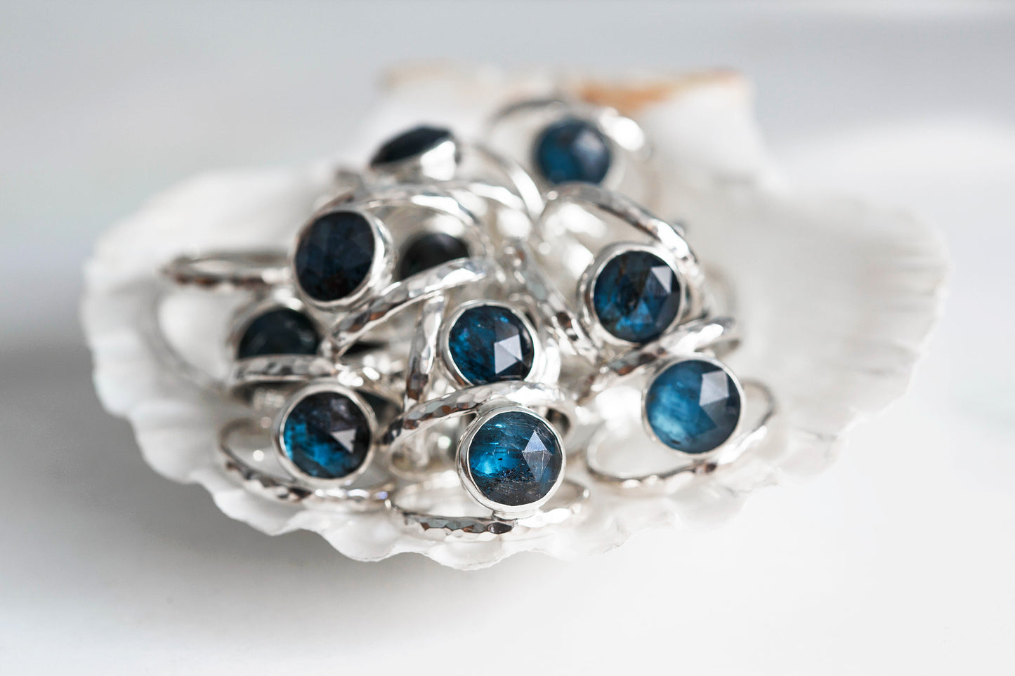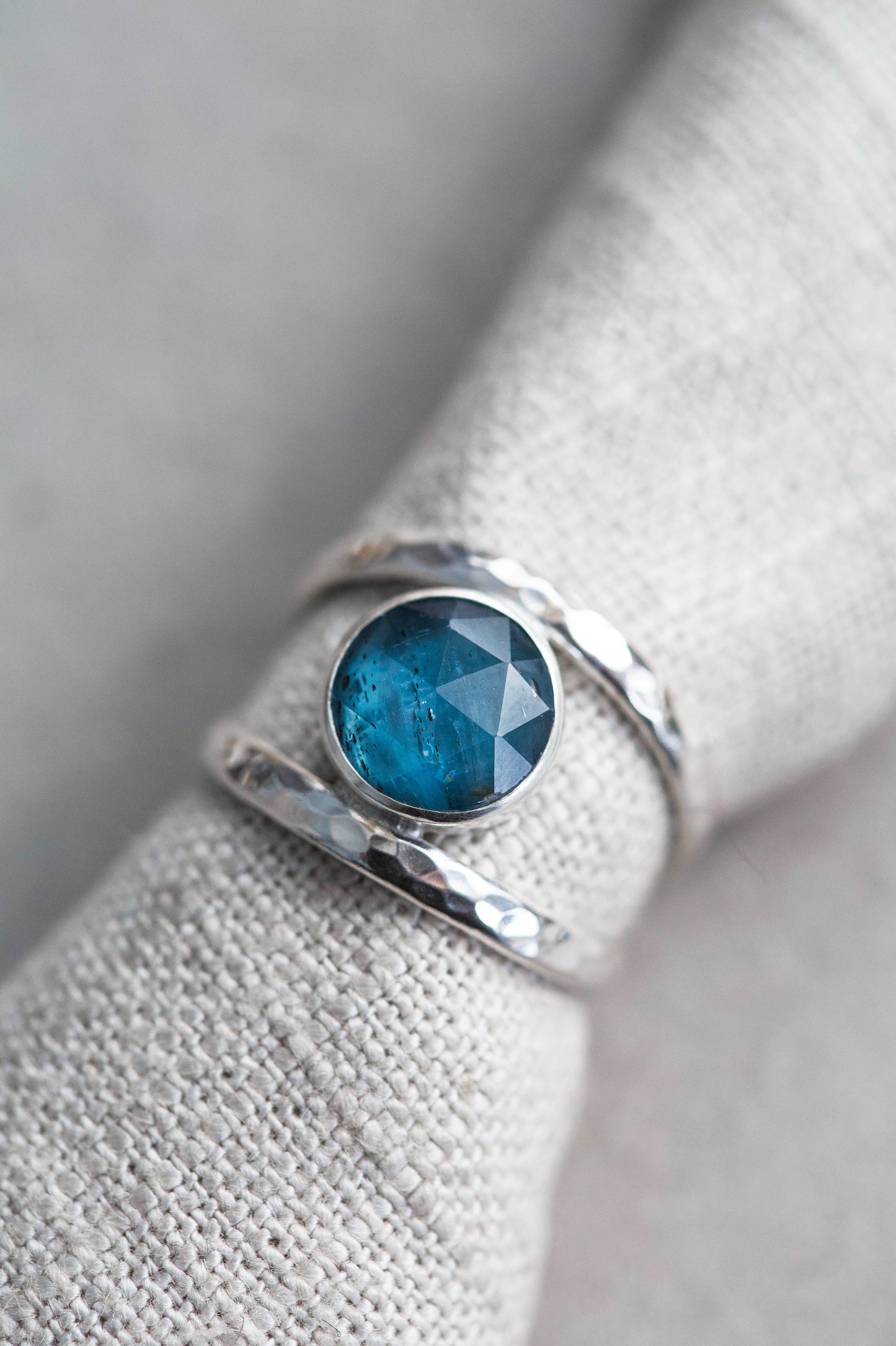The teal blue kyanite gemstone drinks the light and holds it within. Looking into the stone is like looking up towards the light while underwater, dotted with crackling striations and dark inclusions like clusters of algae or leaves from nearby trees. Glistening facets refracting and throwing the light, like ripples on water. A ring for exploring ocean coves still sparkling with sea ice. A ring for the deep Atlantic, all saturated blues and shadows. A ring for mermaids and wave-walkers, ocean explorers with hearts made of sea salt.