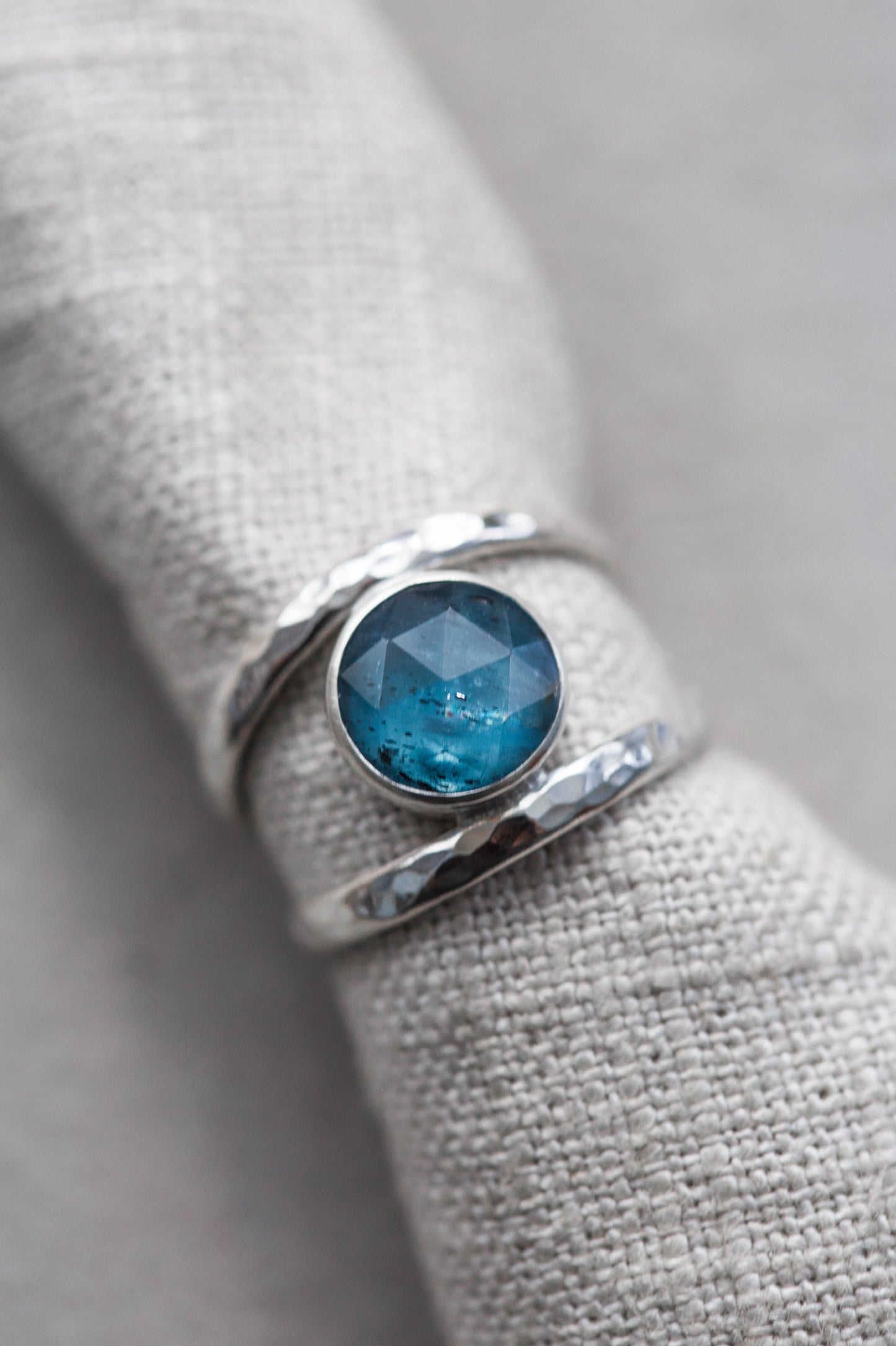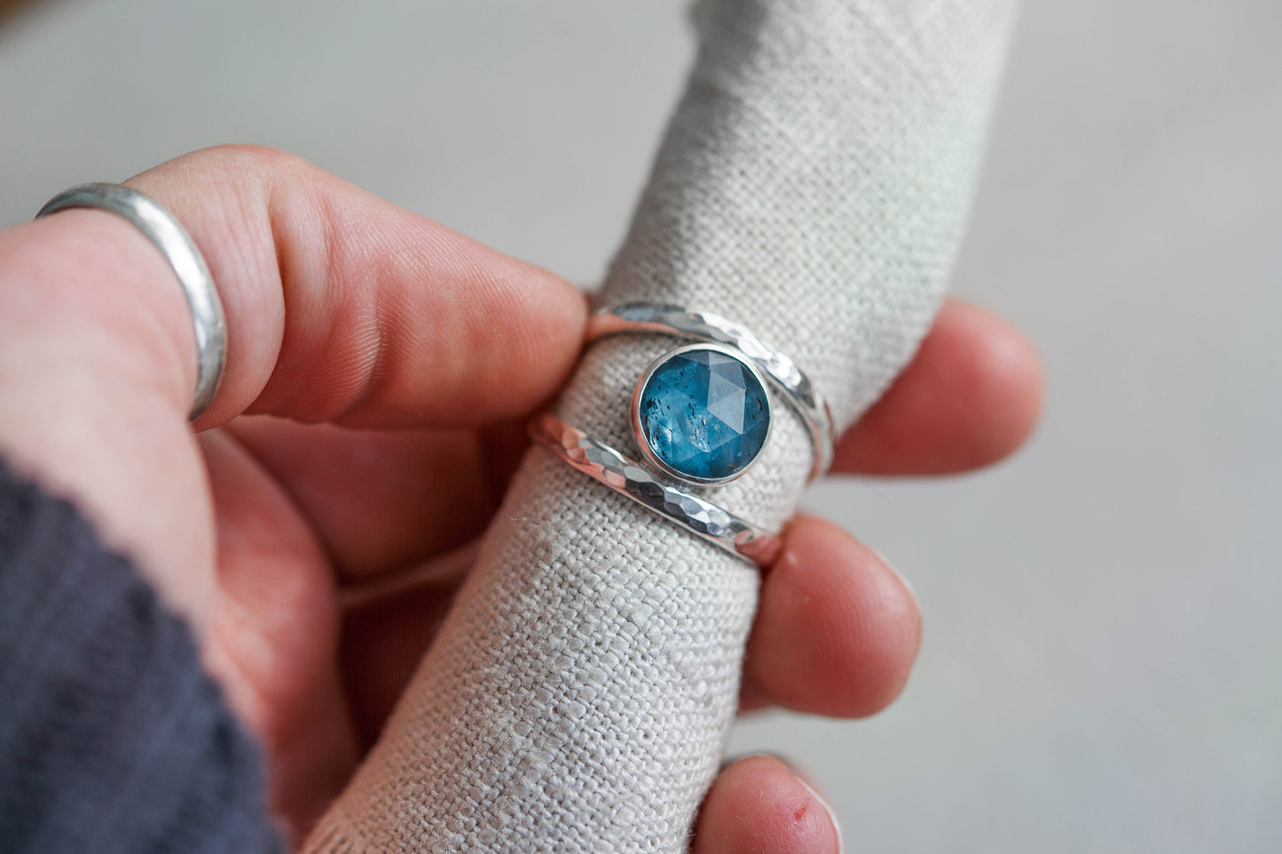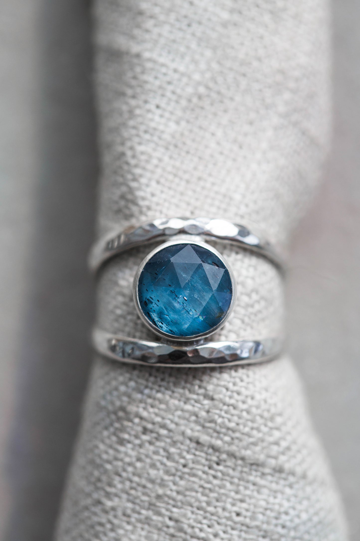 The teal blue kyanite gemstone drinks the light and holds it within. Looking into the stone is like looking up towards the light while underwater, dotted with crackling striations and dark inclusions like clusters of algae or leaves from nearby trees. Glistening facets refracting and throwing the light, like ripples on water. A ring for exploring ocean coves still sparkling with sea ice. A ring for the deep Atlantic, all saturated blues and shadows. A ring for mermaids and wave-walkers, ocean explorers with hearts made of sea salt.