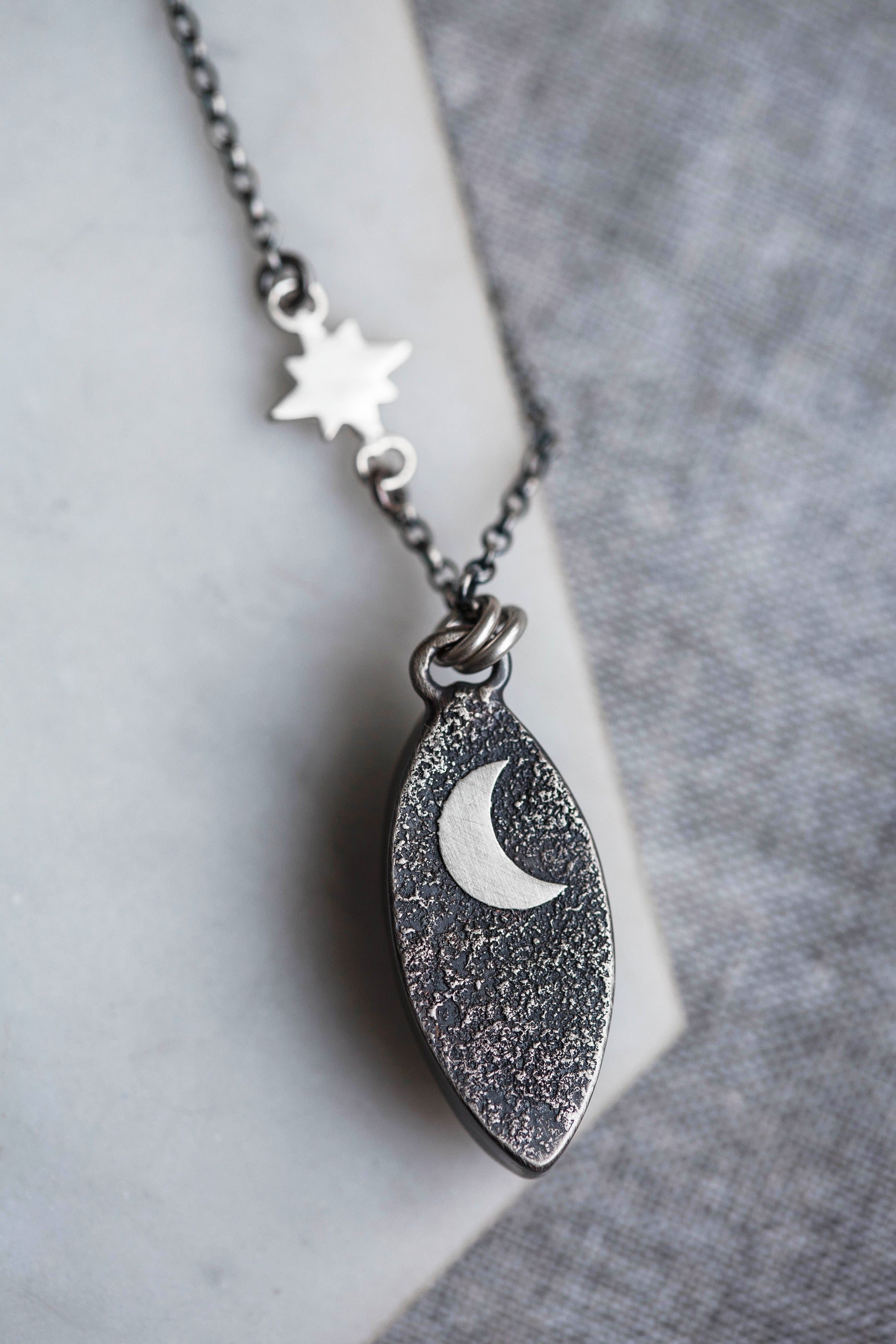 But the backs of the pendants have a secret just for the wearer. Small brushed moons are set amidst a sprinkling of fused silver dust.