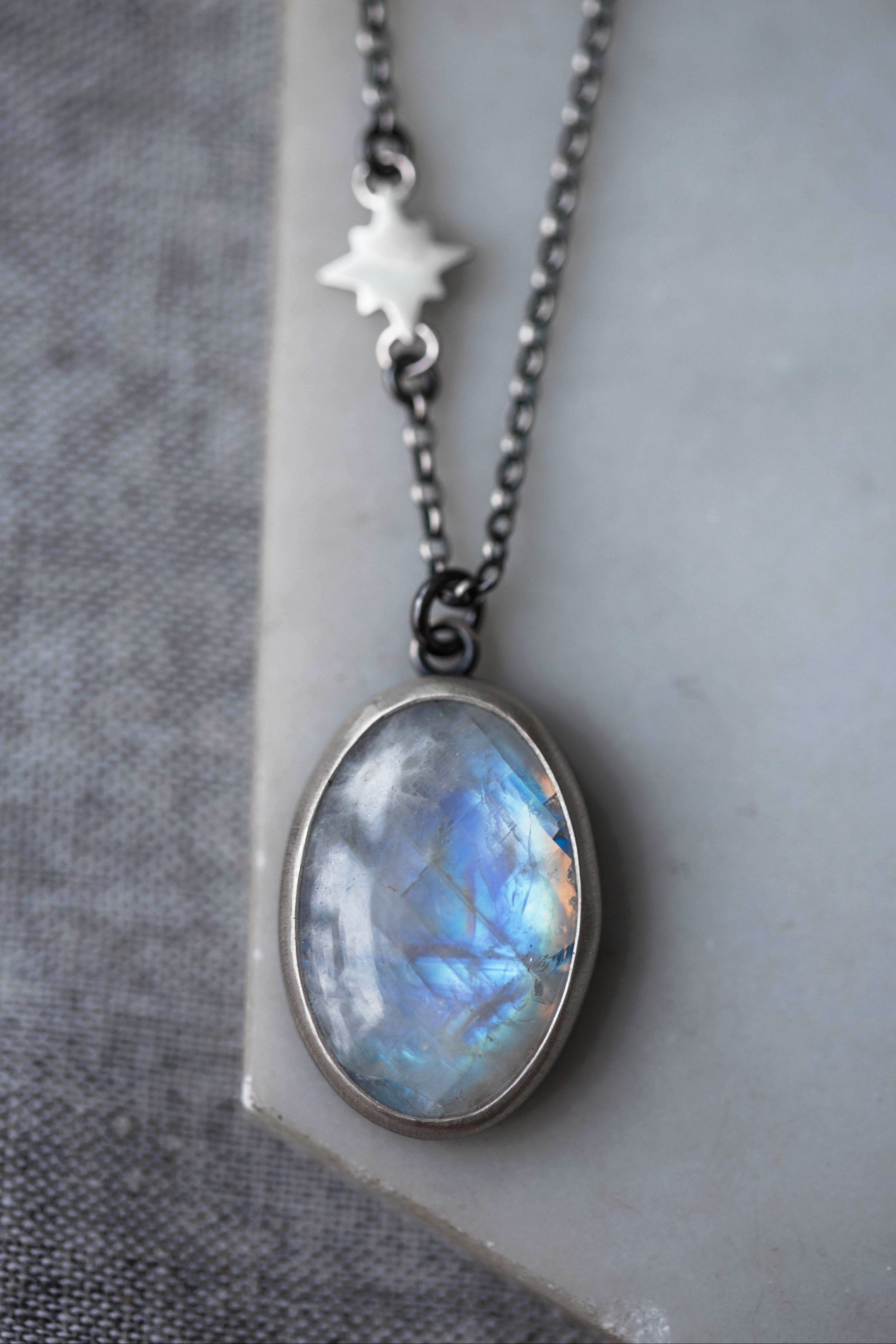 But the backs of the pendants have a secret just for the wearer. Small brushed moons are set amidst a sprinkling of fused silver dust.