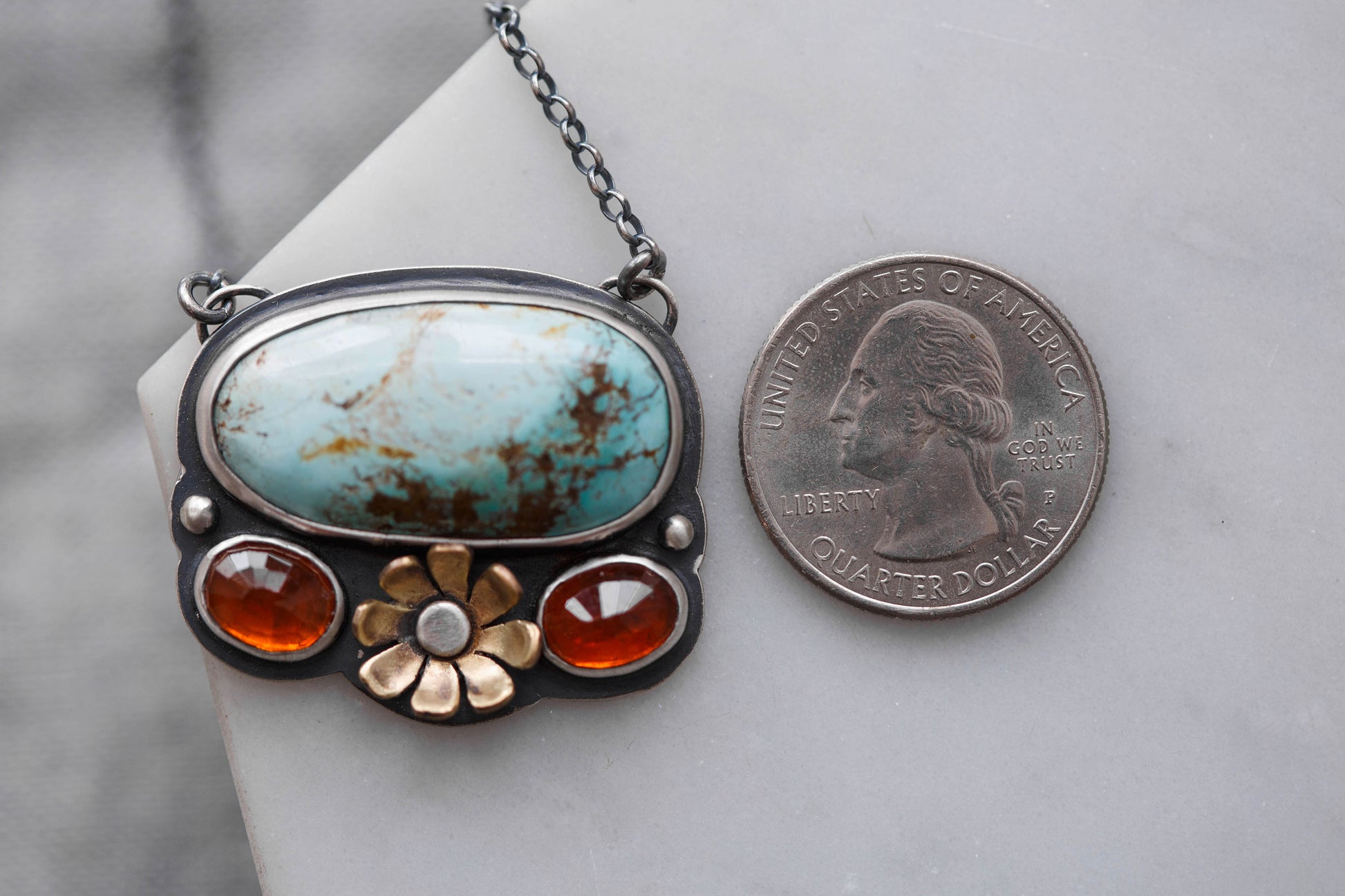 These necklaces all feature a large focal turquoise gemstone, all very different in cut, color, shape, and matrix. As unique as it's wearer. Below each turquoise is a single, warm brass flower, and to either side a faceted hessonite garnet and a tiny sterling silver pebble.