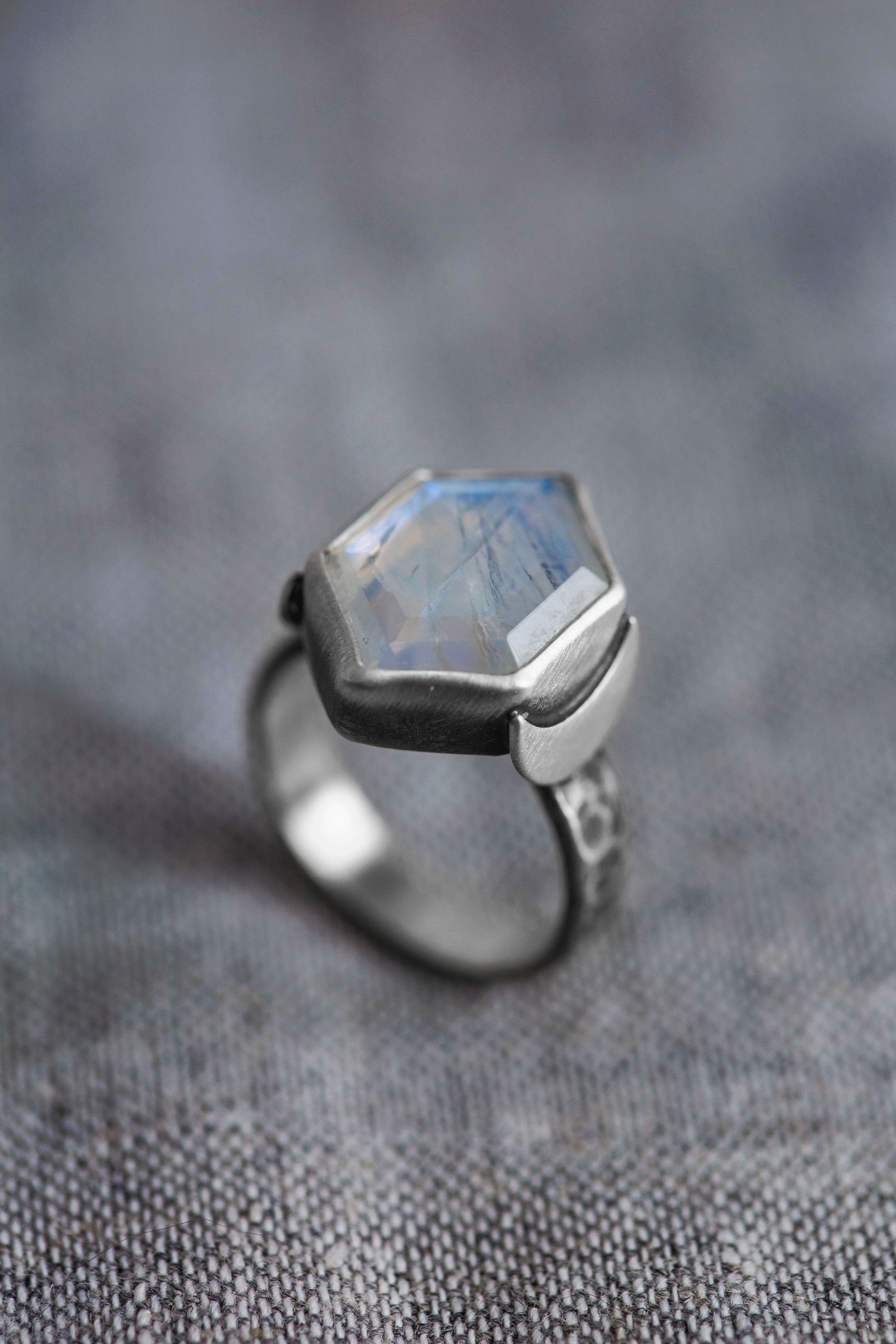 All set in sterling silver, with a brushed silver crescent moon balanced on either side of the stone.