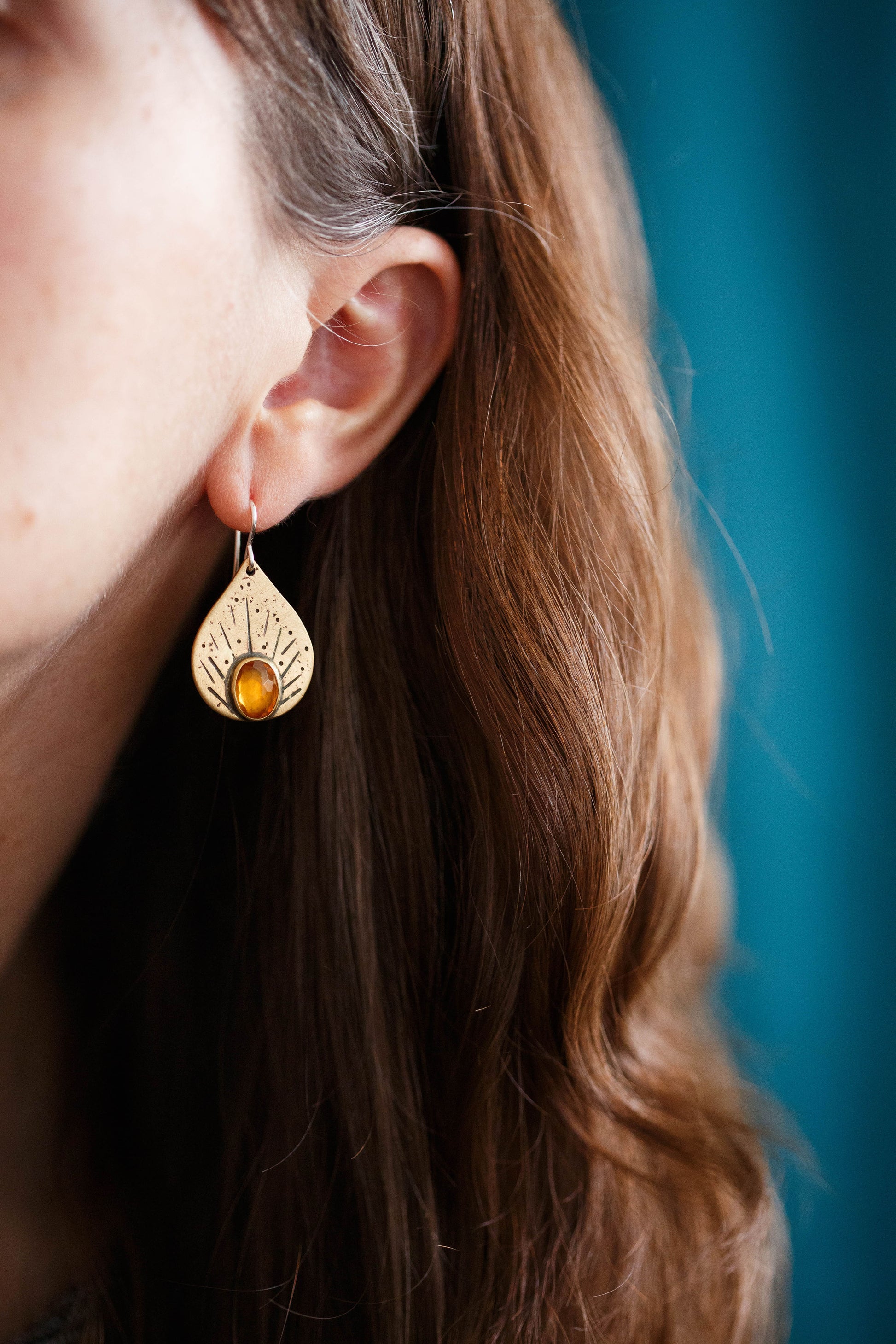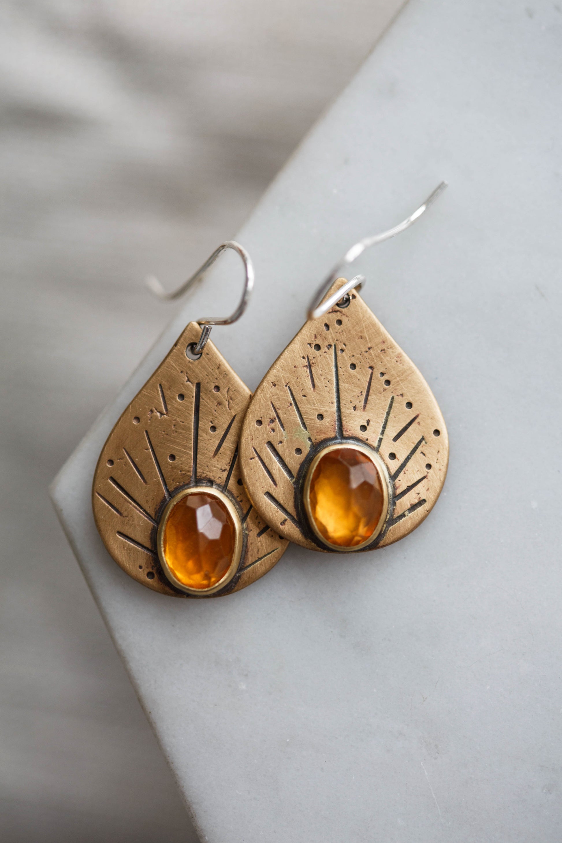 Soft brass teardrops textured and aged to look like relics, the earrings are offered in soft yellow hessonite gemstones or rich orange hessonite gemstones.